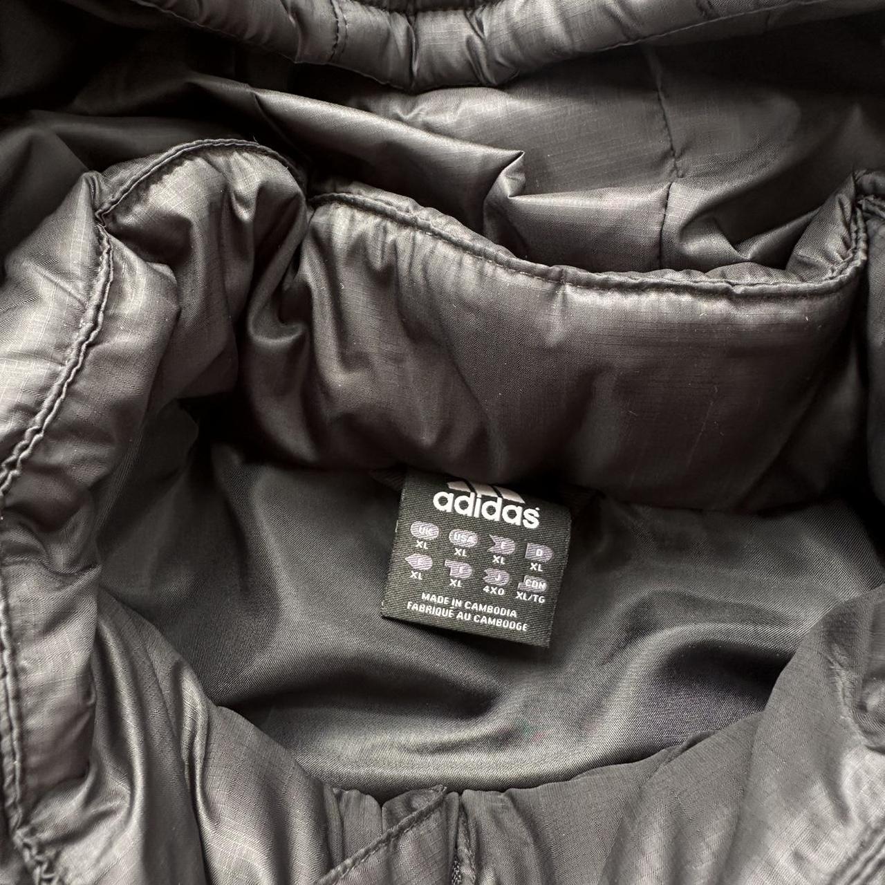 Czarna, zapinana na zamek kurtka puchowa Adidas Y2K z początku XXI wieku, z odpinanym kapturem i haftowanym logo na piersi