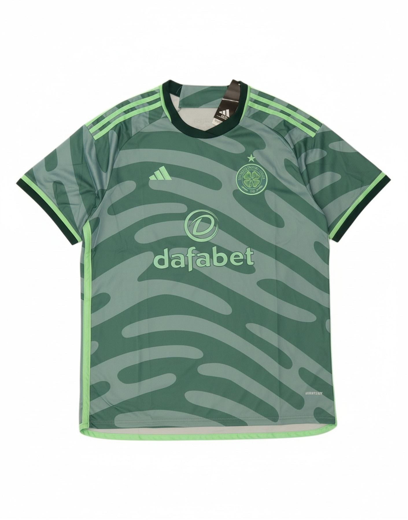 - AI Description: This Adidas mens Graphic T-Shirt Top is crafted from a lightweight, breathable green knit fabric. It features a classic round neck and short sleeves for comfortable wear. The regular fit ensures ease of movement. A distinctive camouflage pattern covers the design, complemented by an embroidered Celtic FC logo. This performance top combines sporty style with practical features, ideal for football enthusiasts.