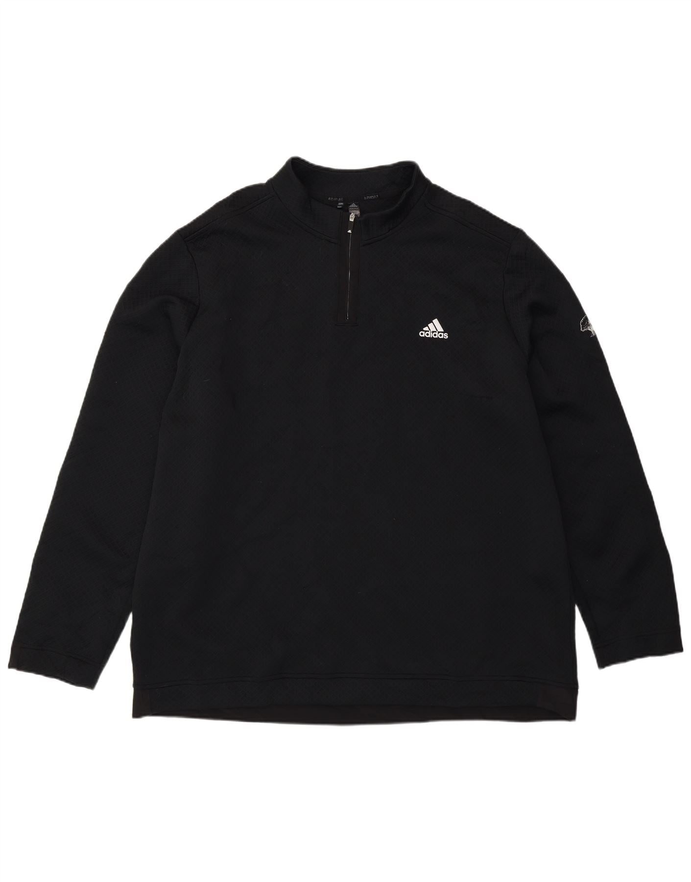 - Opis sztucznej inteligencji: Ta męska bluza Adidas jest wykonana z czarnej dzianiny poliestrowej pochodzącej z recyklingu, o subtelnej geometrycznej fakturze. Ma atrapę szyi i praktyczne zapięcie na zamek błyskawiczny o długości 1/4. Długie rękawy i regularny krój zapewniają wygodę. W projekcie zastosowano dyskretny akcent logo Adidas. Ten oddychający i lekki element jest idealny do uprawiania sportu, zwłaszcza gry w golfa.