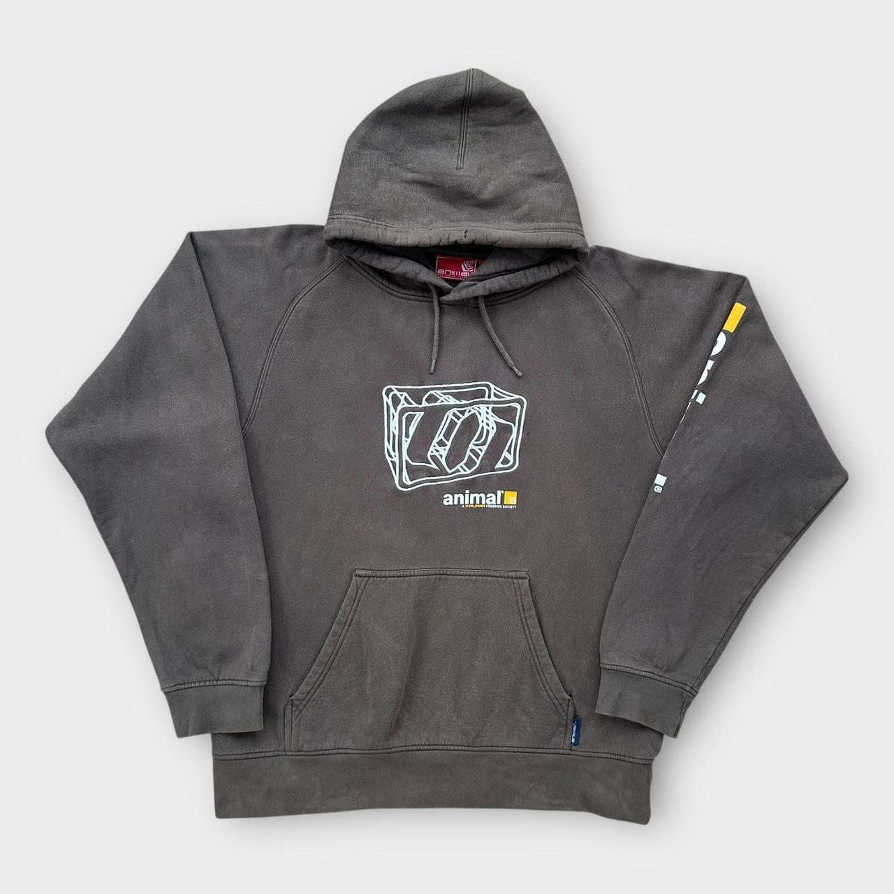 Haftowana bluza z kapturem w kolorze brązowym, z haftem na piersi i nadrukiem wzdłuż ramienia, Y2K Animal z początku XXI wieku