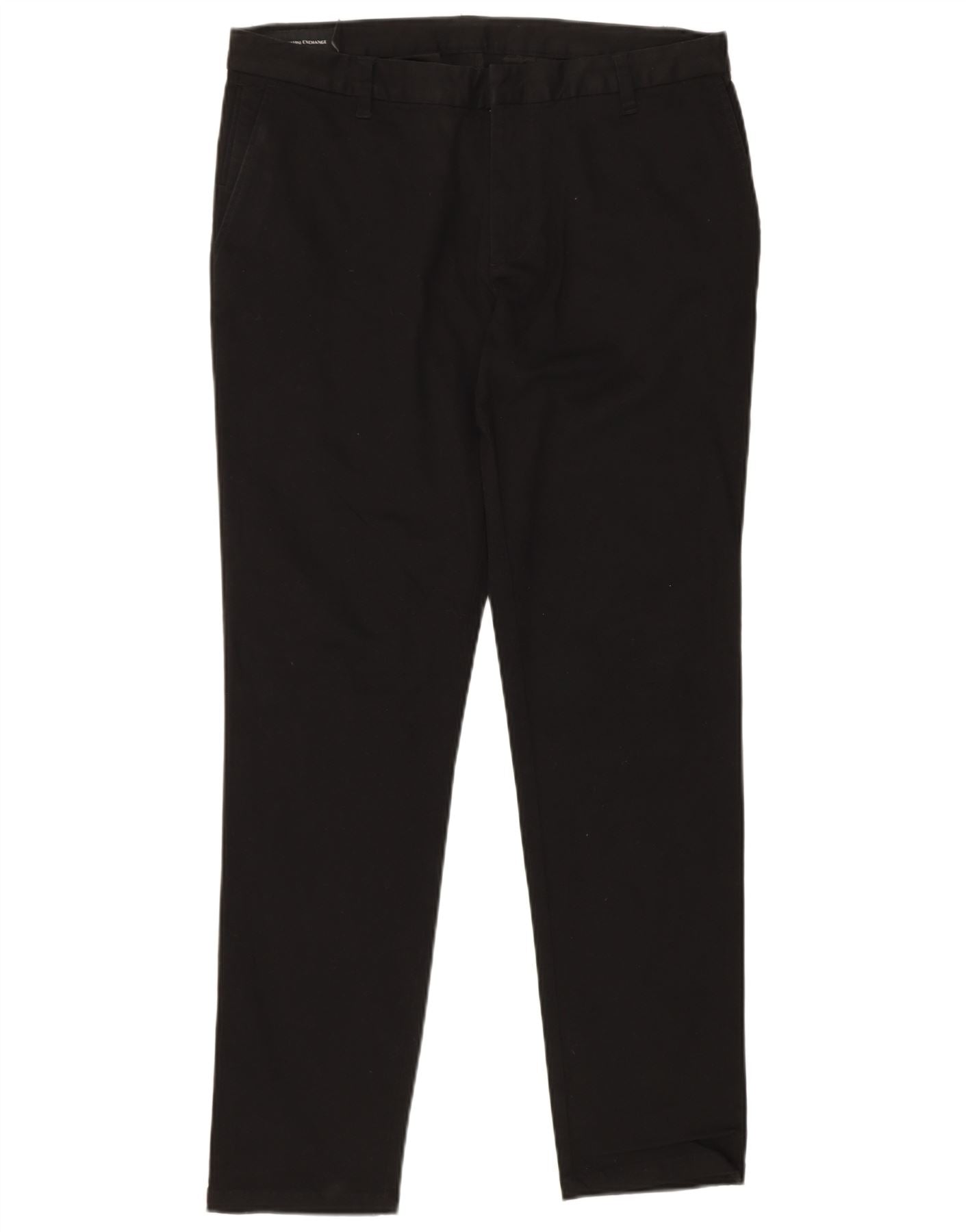 - AI Description: These Armani Exchange mens chino trousers are crafted from a black woven cotton blend with stretch. They feature a slim fit through the leg, tapering neatly to the ankle. A button closure secures the waist. Practical pockets are included. A subtle logo accent adds a signature touch. The classic style offers a smart yet comfortable look.