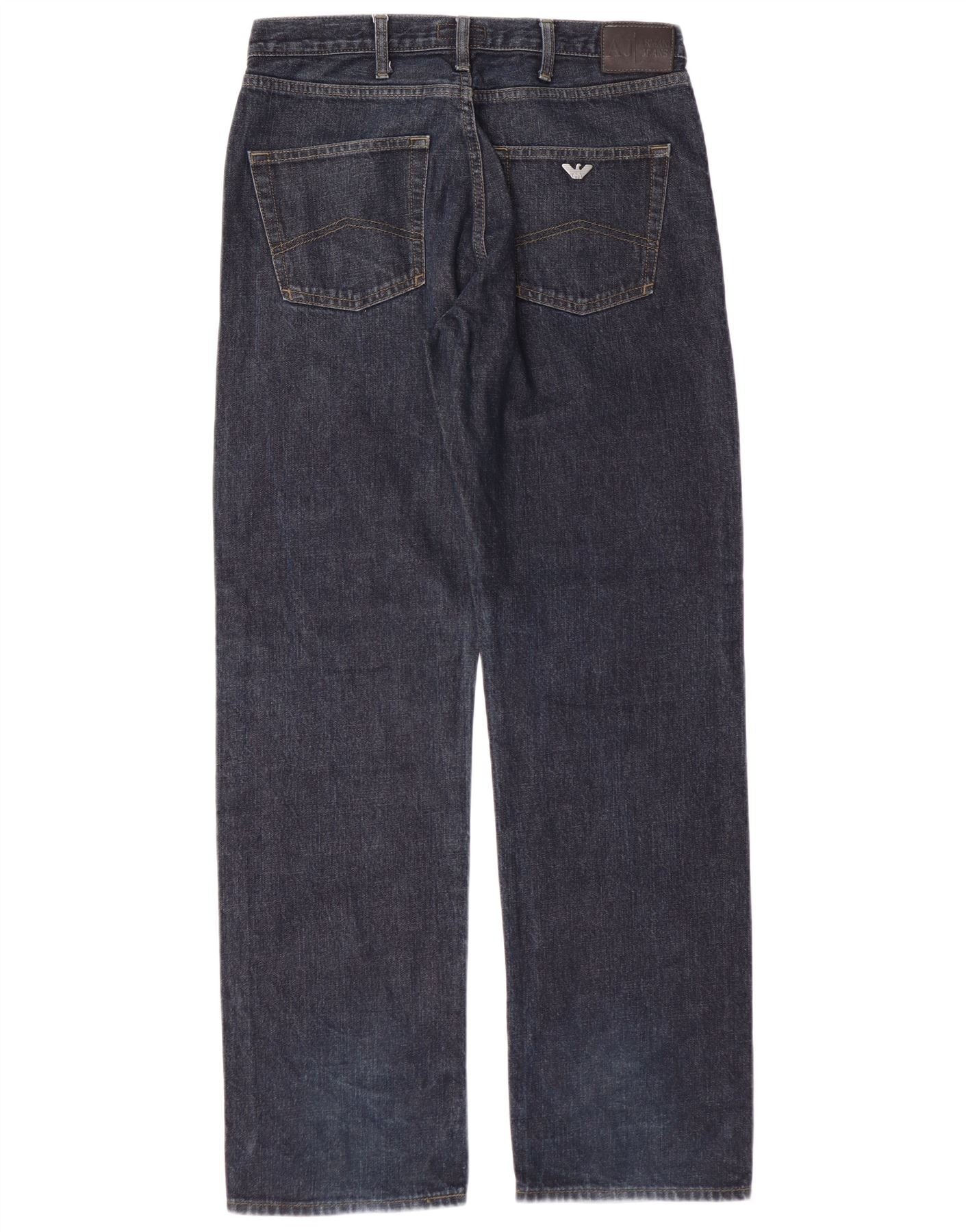 - AI Description: These Armani Jeans men's straight jeans are crafted from 100 percent cotton denim in a rich navy blue. They feature a classic straight leg and a regular fit for comfort. The button closure ensures a secure wear. Practical pockets are included, and a subtle logo accent adds brand recognition. This classic fit offers timeless style and versatility.