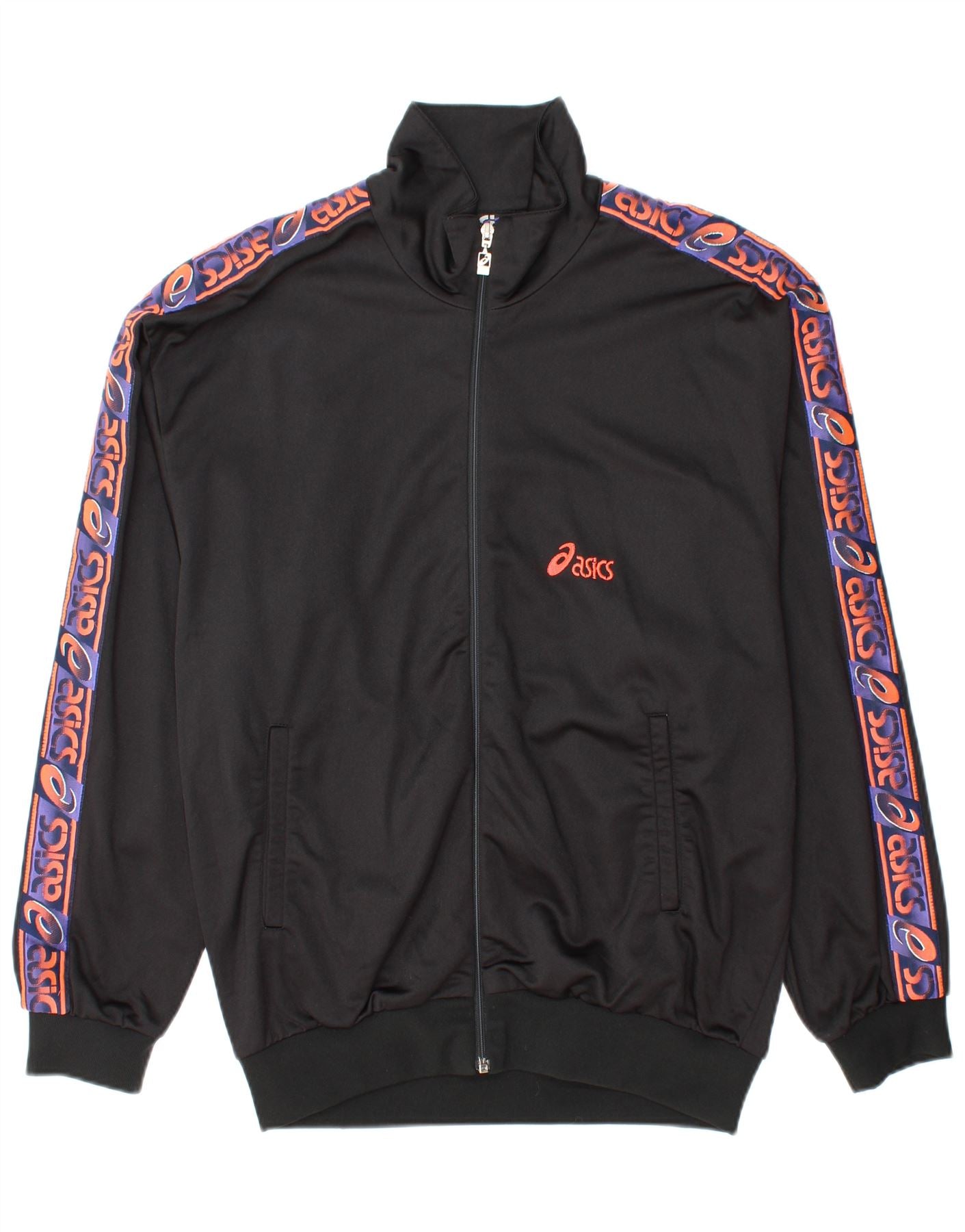 - AI Description: This Asics mens tracksuit top jacket is crafted from 100 percent polyester jersey, offering a smooth and breathable feel. It features a collared neckline and a full zip closure for versatile wear. Long sleeves provide ample coverage. The regular fit ensures comfort and ease of movement. A subtle logo accent adds a classic retro touch. Designed for sports, this jacket combines functionality with a timeless athletic style.