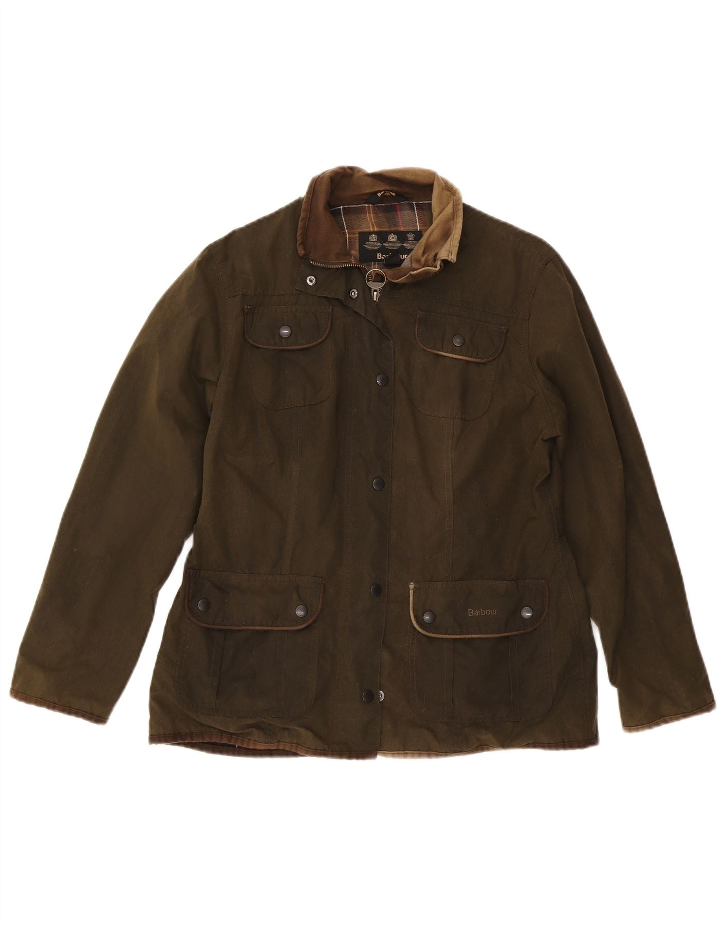- AI Description: This Barbour womens waxed cotton jacket is crafted from durable khaki woven wax fabric. It features a classic collared neckline and long sleeves. The regular fit ensures comfortable wear. A full zip closure is complemented by button accents. Practical pockets add utility. A subtle plaid pattern enhances its classic style.