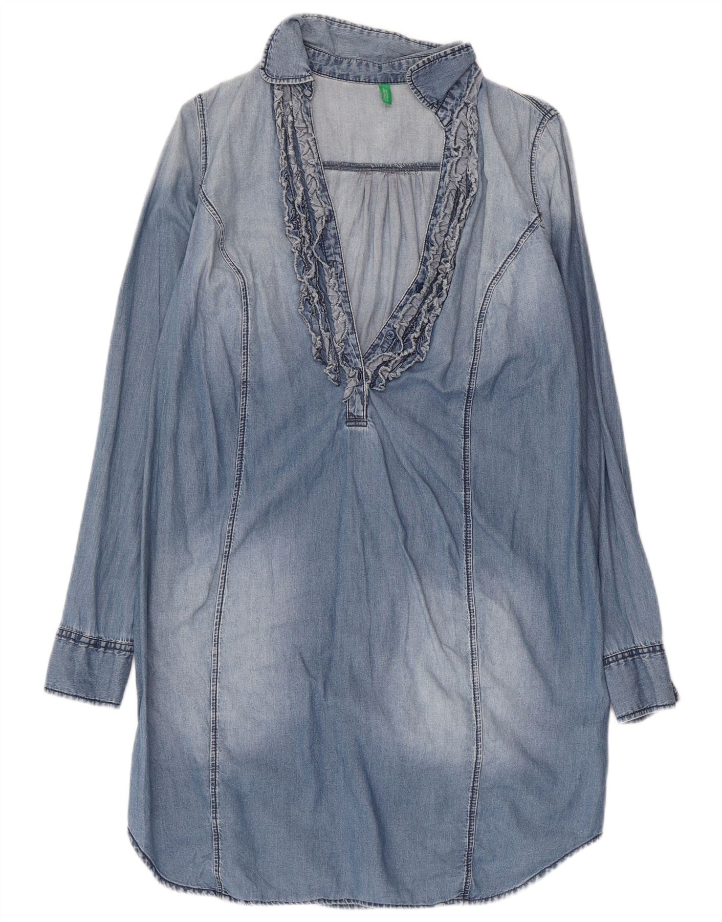 Home > Vintage odzież Benettona > Damskie > BENETTON Damska oversize'owa sukienka dżinsowa z falbaną z przodu UK 6 XS, niebieska bawełna