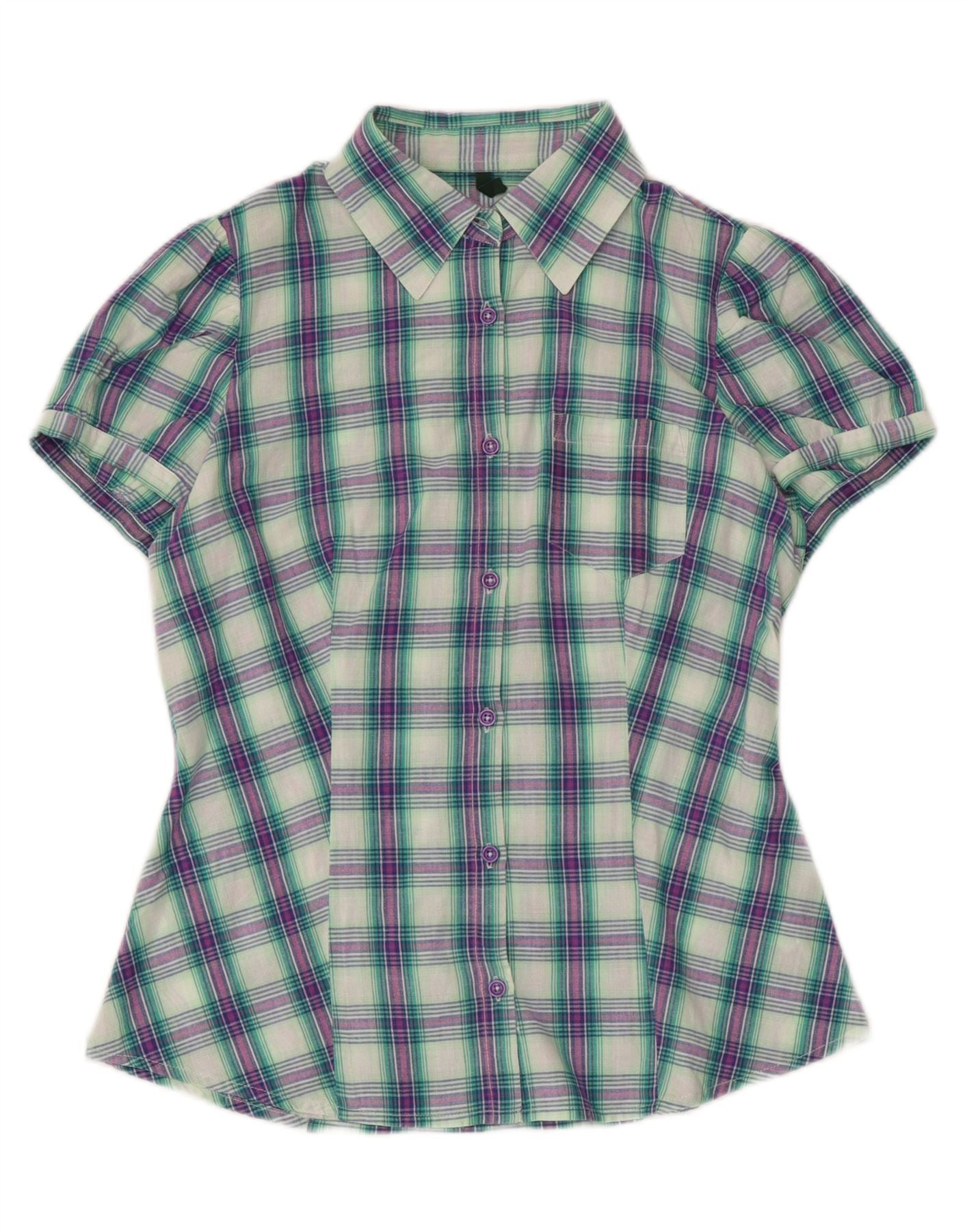 Home > Vintage odzież Benettona > Damskie > Koszula damska BENETTON z krótkim rękawem UK 14, średnia, wielokolorowa, bawełniana w kratę