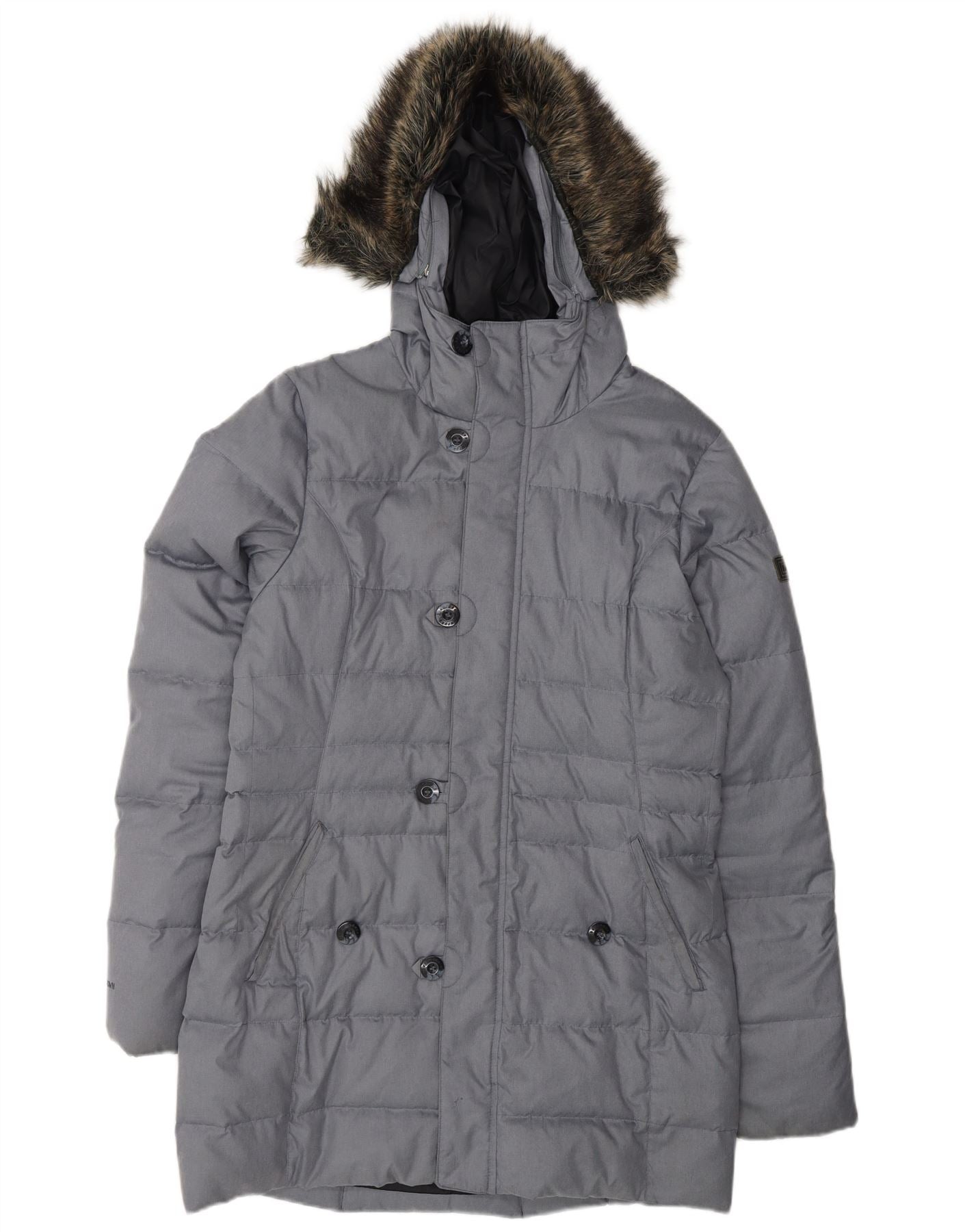 - AI Description: This Berghaus womens padded coat is crafted from durable grey polyester, featuring a quilted down and feather fill for warmth. It boasts a high neck and a practical hood with a fur trim. Long sleeves provide full coverage. The regular fit ensures comfort and ease of movement. A button closure secures the front, complemented by convenient zipped pockets. This winter coat offers essential warmth and a classic, functional design.