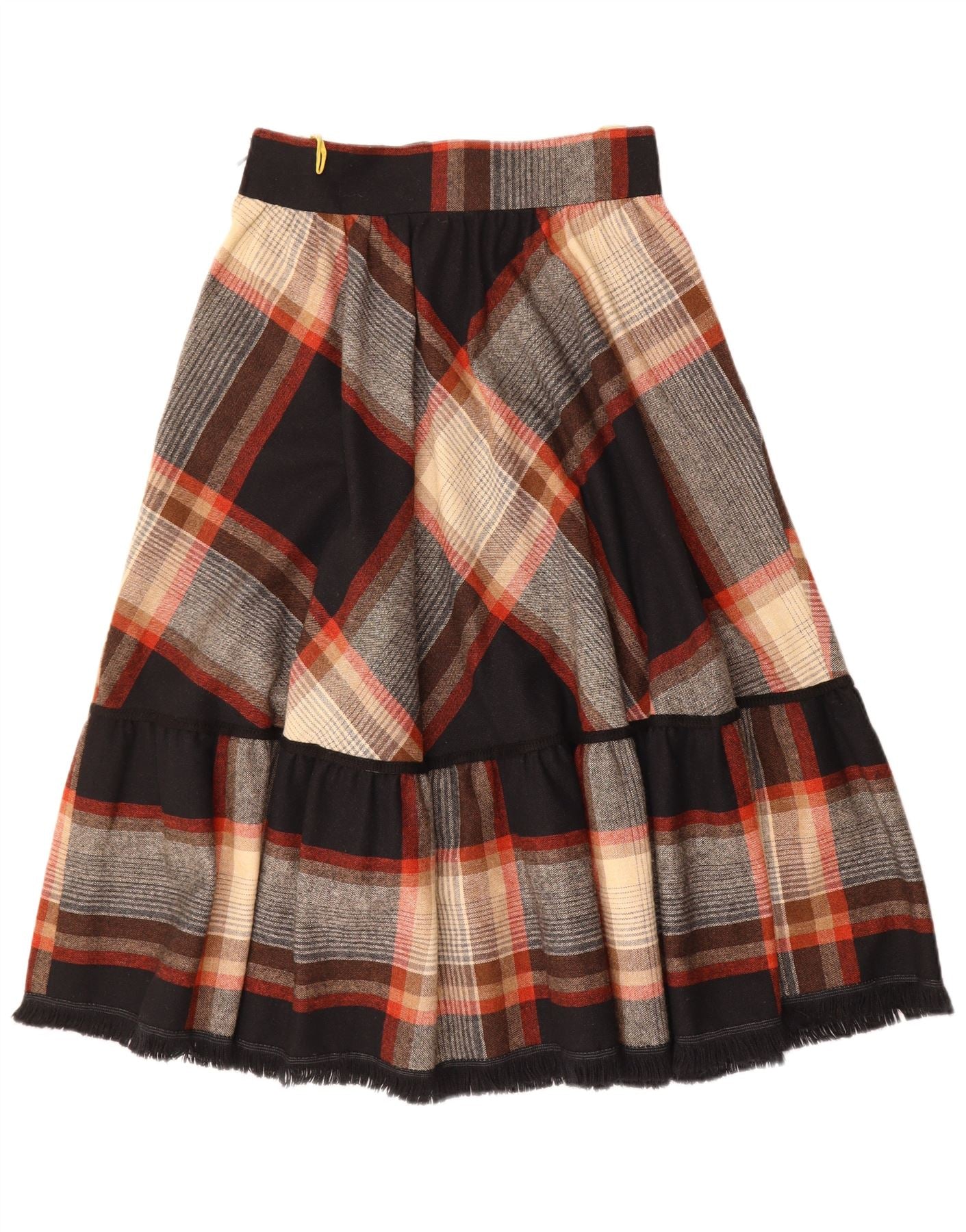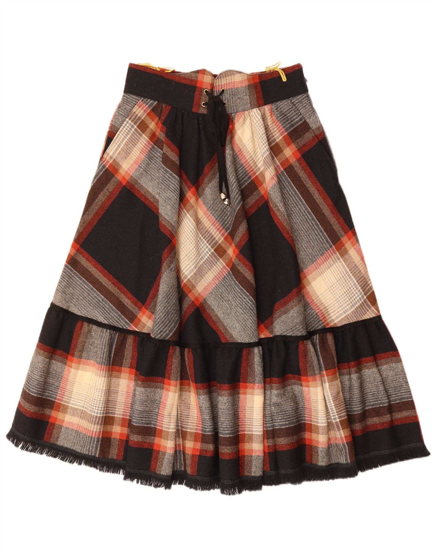 - AI Description: This C&A womens Tiered Skirt is crafted from a woven fabric, offering a comfortable feel. It features a vibrant multicoloured plaid pattern, incorporating black, beige, and red tones. The high waist design creates a flattering silhouette. Its tiered structure adds graceful movement and a classic style. A practical drawstring closure ensures an adjustable waist for a perfect regular fit. Ruffle accents enhance its feminine charm.