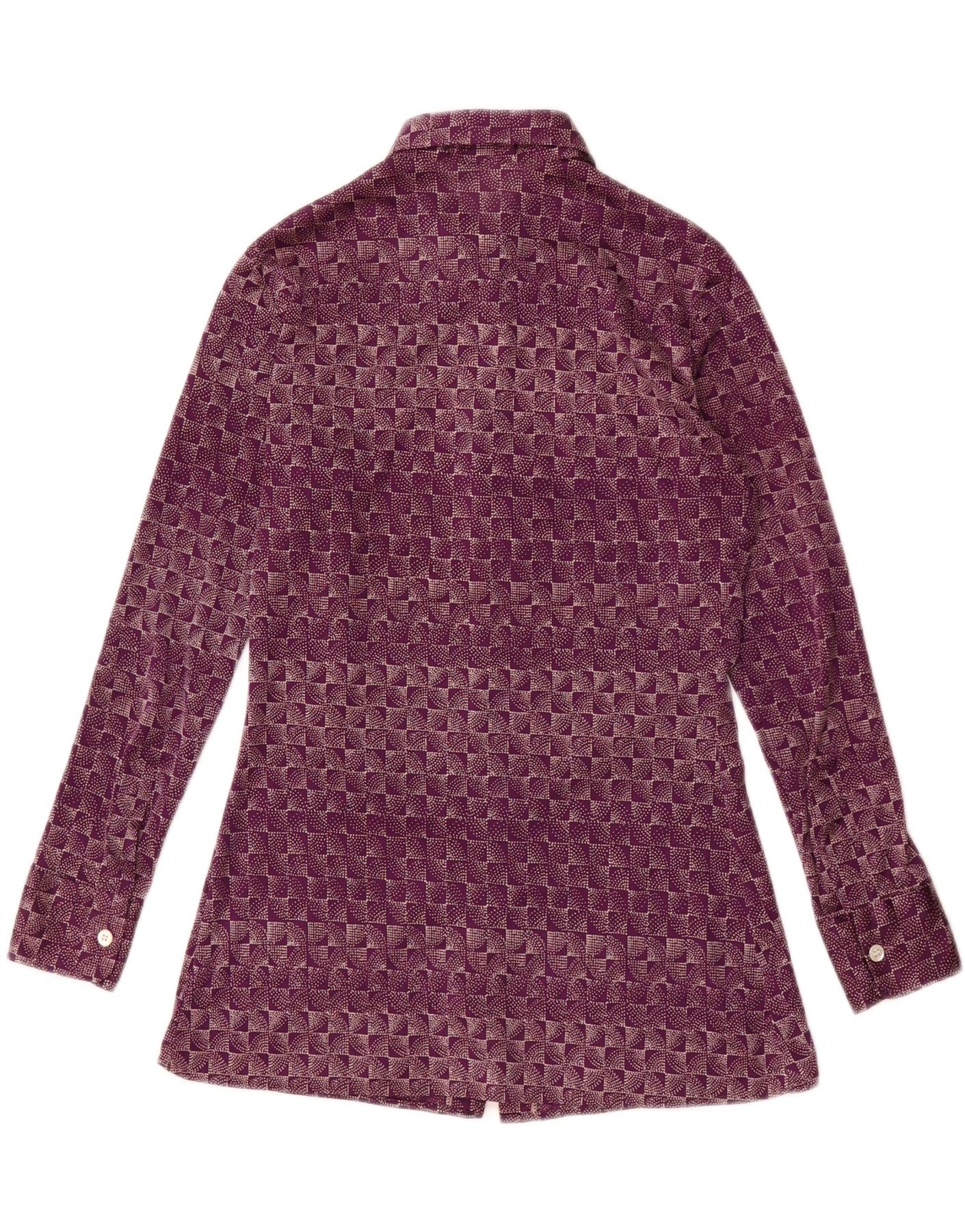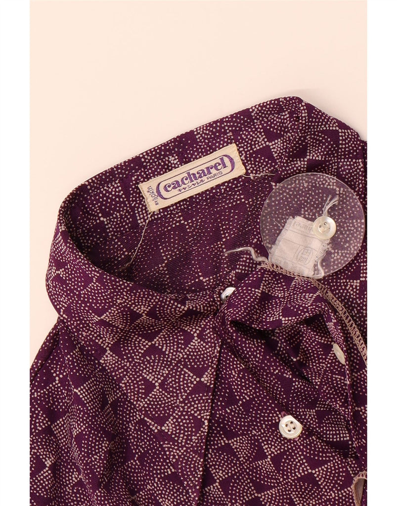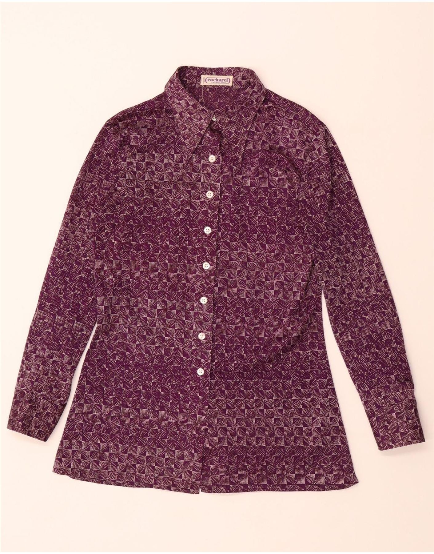 - AI Description: This Cacharel womens shirt blouse is crafted from a lightweight synthetic woven fabric, offering a smooth finish. It features a distinctive geometric pattern in a rich purple hue. The collared neckline and full button-up front maintain a classic silhouette. Long sleeves finish with neat buttoned cuffs. A regular fit ensures comfortable wear and timeless appeal. Its retro style offers a sophisticated, unique look.