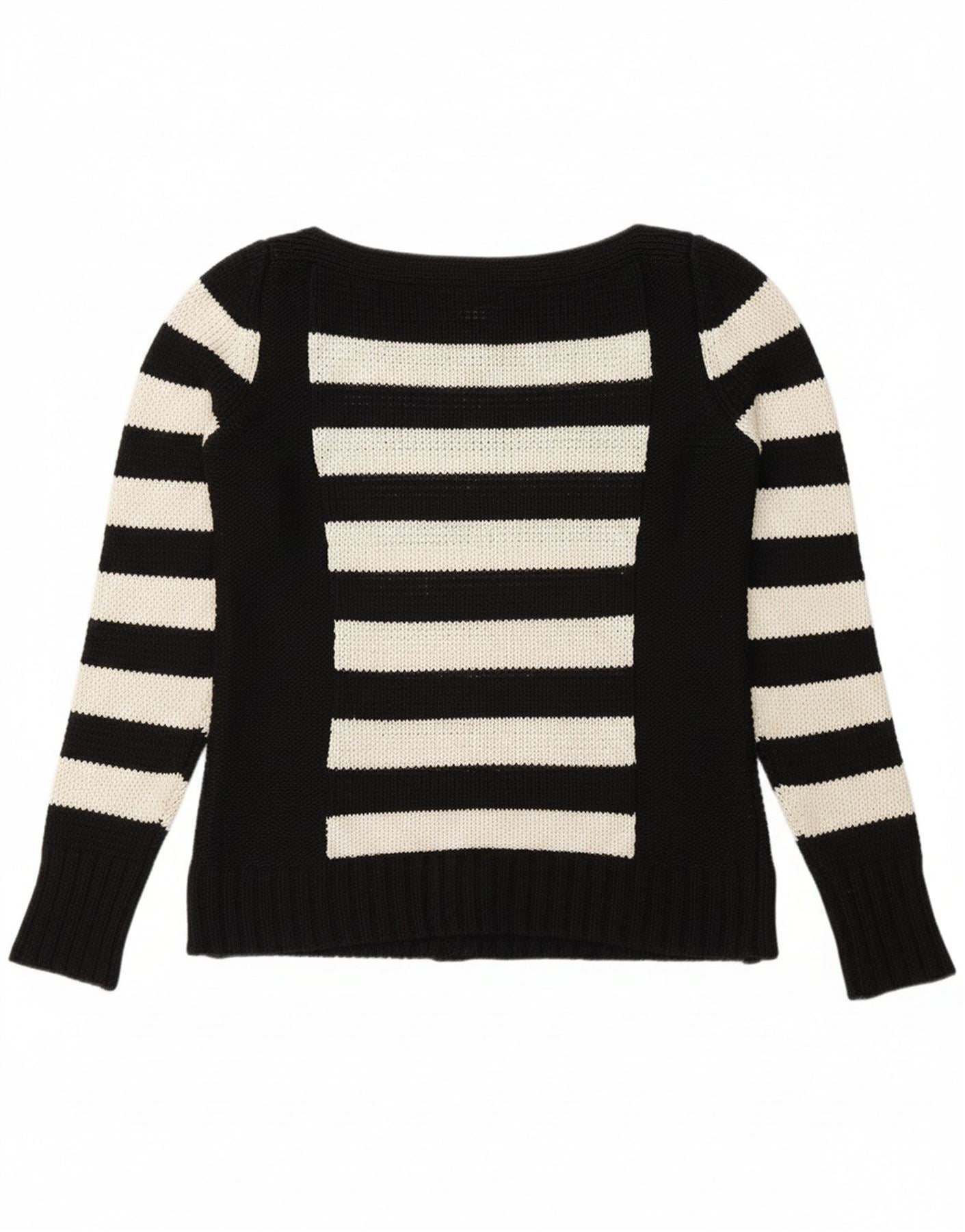 - AI Condition: Pre-owned | grade: Moderate | location: Throughout the white stripes of the sweater | type: Discoloration | grade: Minor | location: Throughout the knit fabric | type: Visible wear | grade: Minor | location: Bottom hem on the back left side | type: Loose stitching