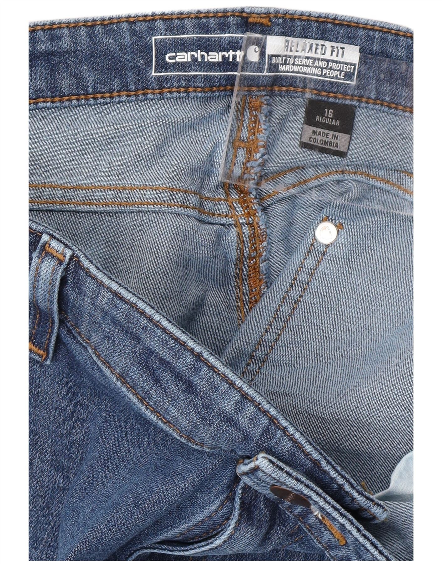 - AI Description: These Carhartt womens loose jeans are crafted from durable blue denim. They feature a relaxed fit through the leg, ensuring comfort and ease of movement. A classic button closure secures the waist. The design includes practical pockets for functionality. A subtle Carhartt logo adds a signature accent. This classic style offers lasting appeal and everyday versatility.