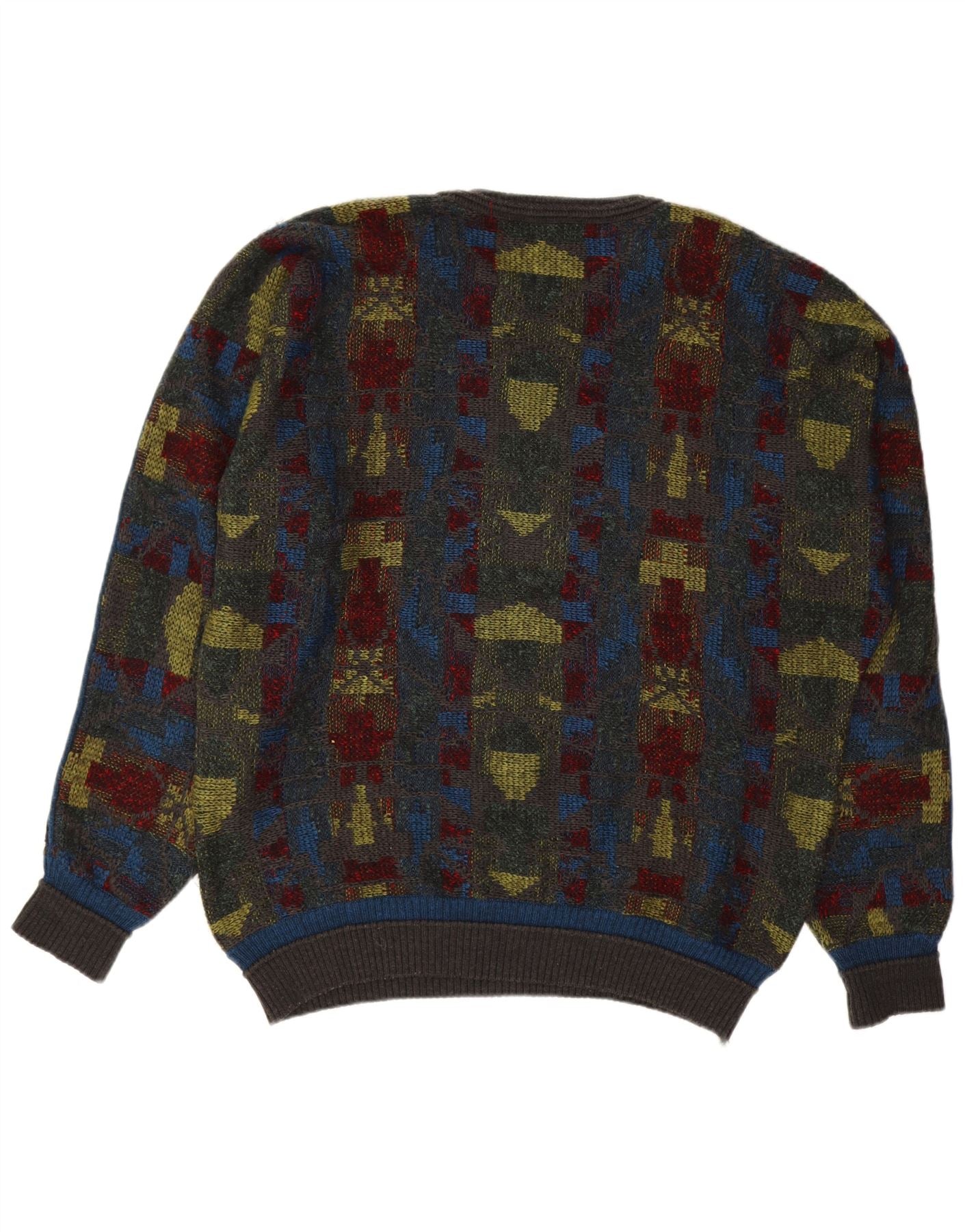 - AI Description: This Vintage mens Crew Neck Jumper Sweater is crafted from a soft knit blend of new wool and polyacrylic. It features a striking multicoloured geometric abstract pattern. The classic round neck and long sleeves offer a comfortable silhouette. A regular fit ensures ease of wear. This retro style piece provides warmth and distinctive visual appeal.