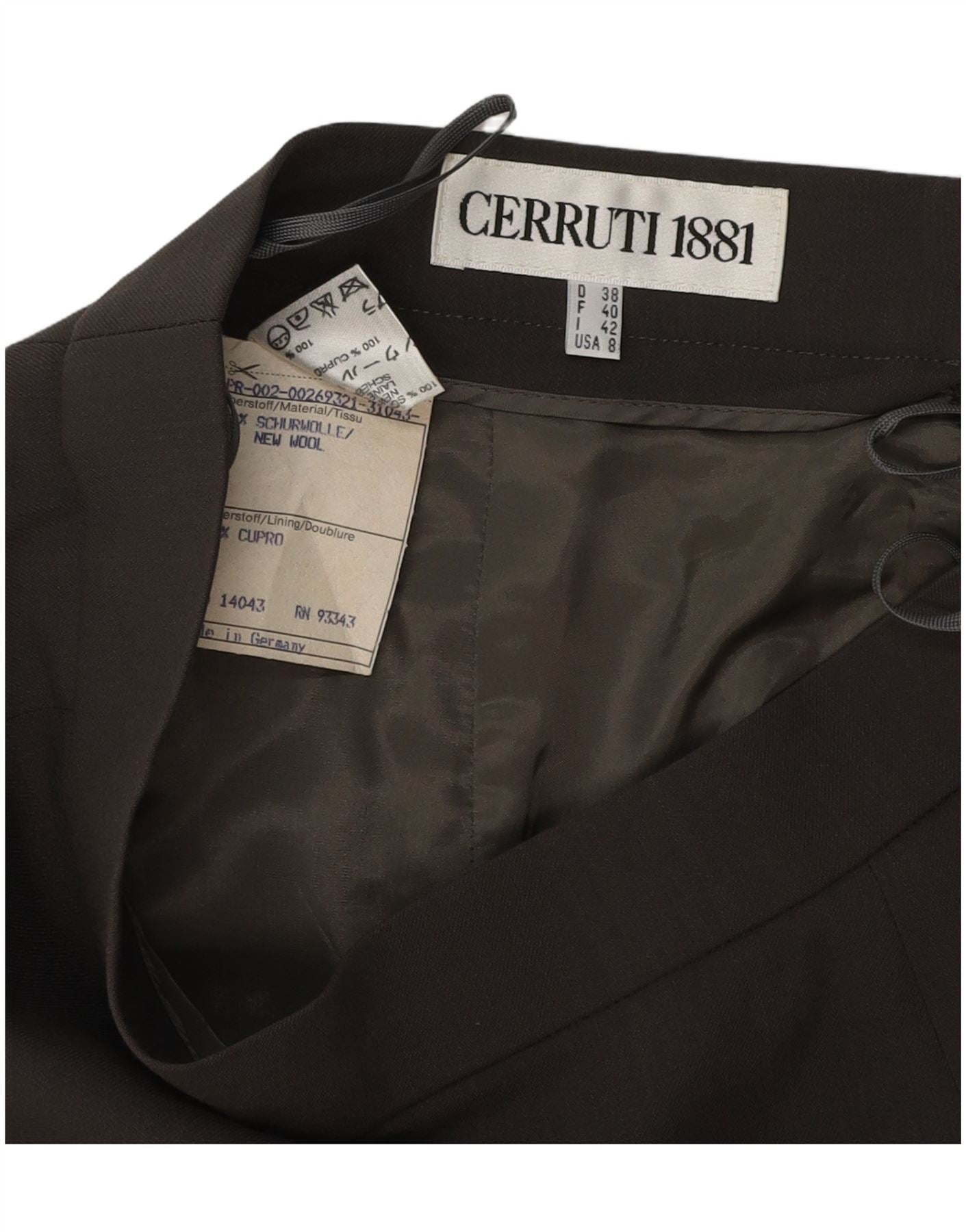 - AI Description: This Cerruti 1881 womens pencil skirt is crafted from luxurious 100 percent New Wool. Its woven fabric offers a refined, smooth texture. It is fully lined with 100 percent Cupro for comfort. The slim fit silhouette tapers elegantly, creating a sophisticated profile. A classic button closure secures the waist. The rich brown colour provides a versatile, professional look. This classic style features a clean, unpatterned design, emphasising its premium material and tailored cut.