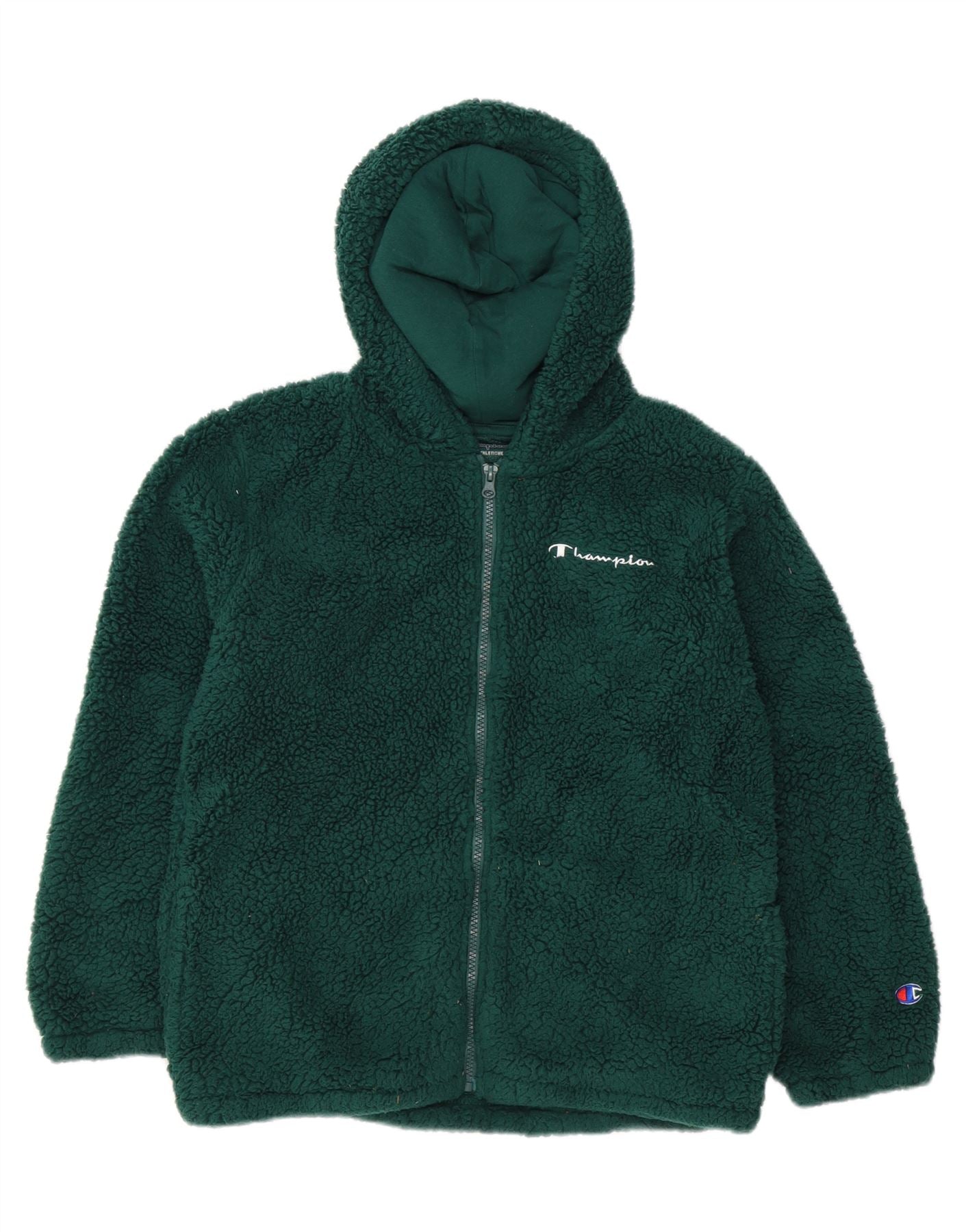 - AI Description: This pre-owned Champion hoodie jumper is in excellent condition. The garment is green and crafted from soft fleece fabric. It features a full zip closure, long sleeves, and a regular fit for comfortable wear. The design includes a hood and practical pockets. Accented with the iconic Champion logo. Note minor loose stitching on the zipper and sleeve, and slight discoloration on the tag. Label size XL.