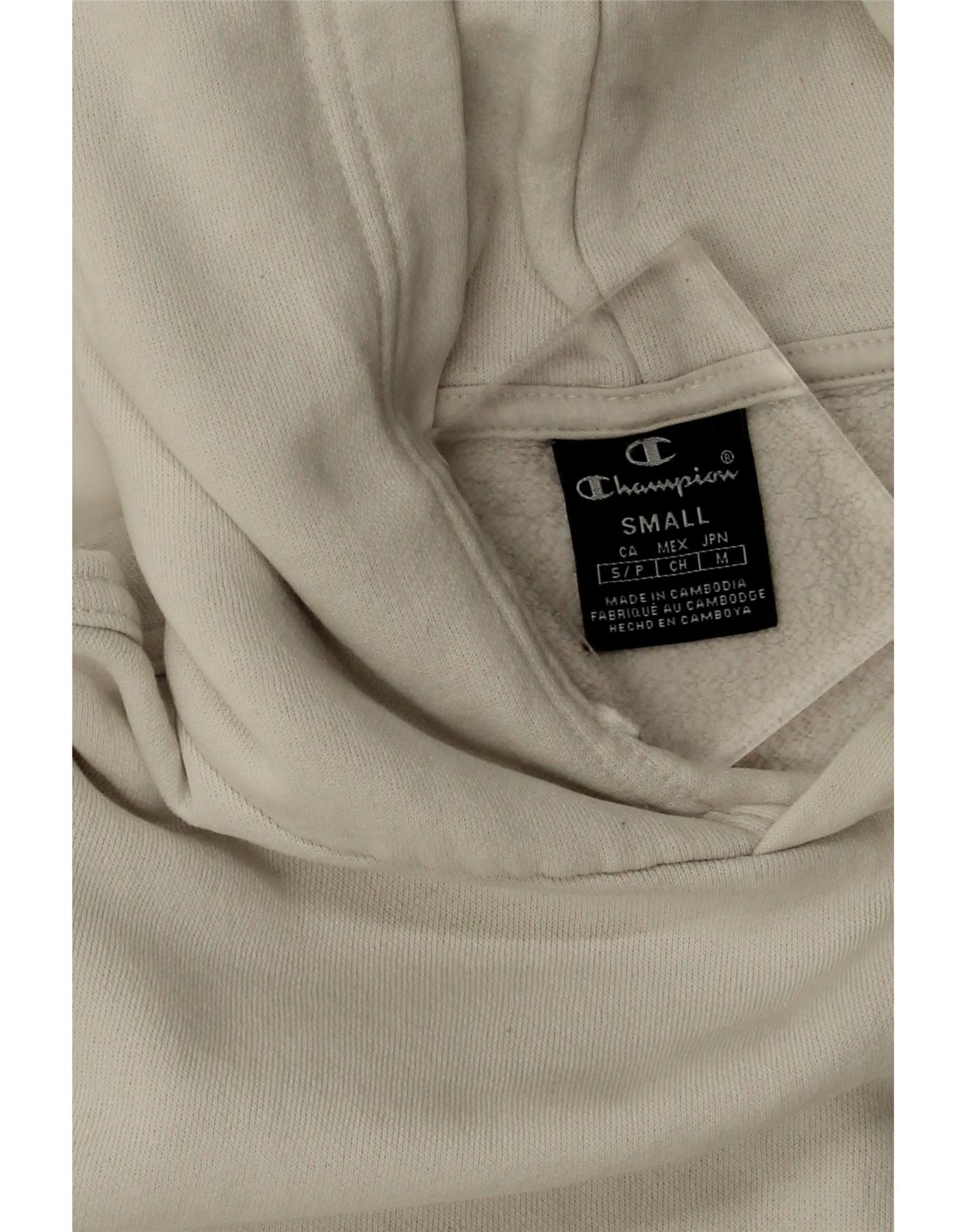 • Stan: Stan dostateczny: przedmiot był często noszony i mógł mieć liczne wady – Kolor wyblakły. Brak sznurka do ściągania kaptura. Lekko falujący materiał. Znak na kieszeni. Znak na rękawie.
