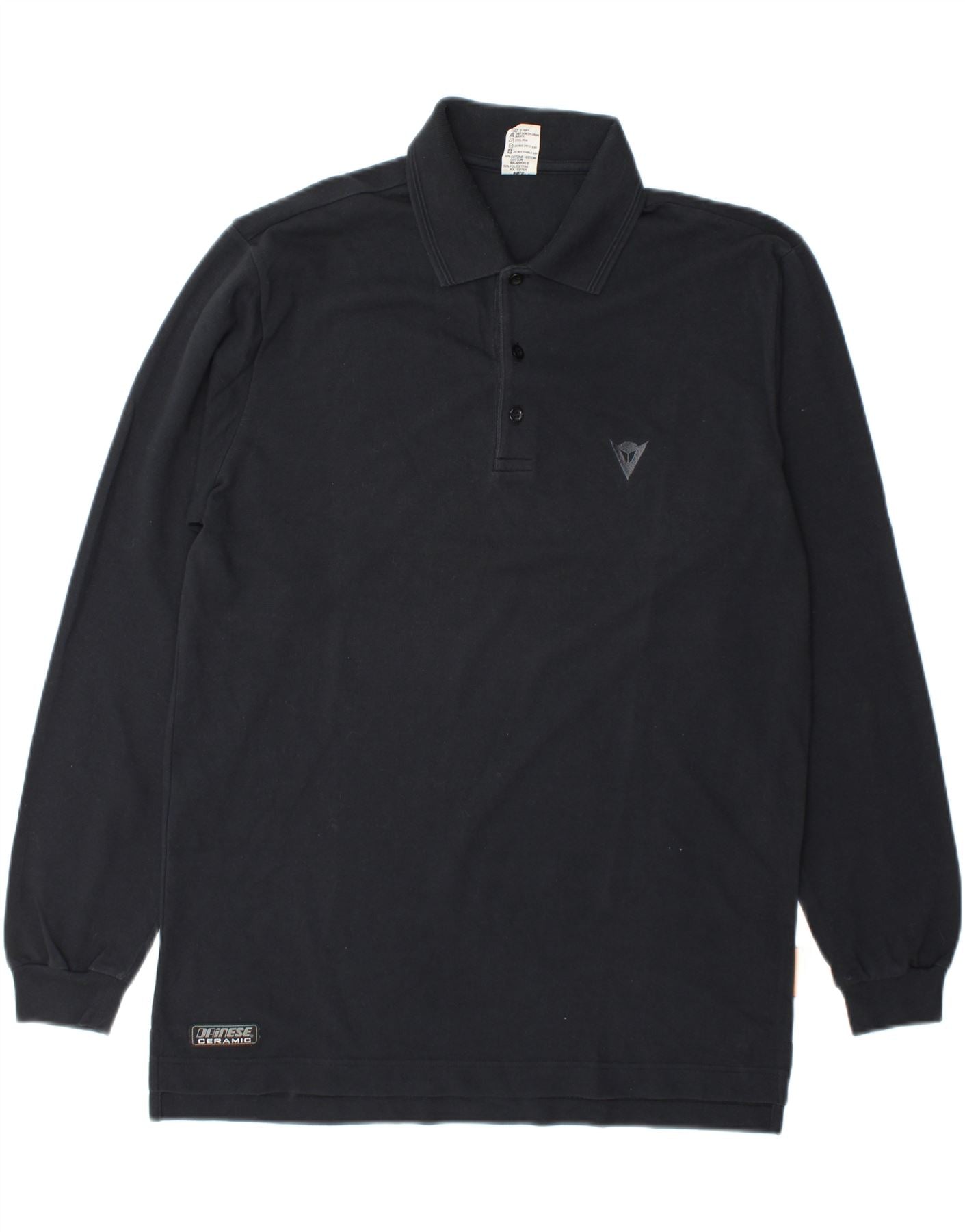 - AI Description: This Dainese men’s polo shirt is crafted from a comfortable black knit fabric. It features a classic collared neckline with a clean button-up front. Long sleeves provide ample coverage. A regular fit ensures comfortable wear for active days. The design is subtly accented with a brand logo, reflecting its sports style. This piece offers both comfort and a refined look.