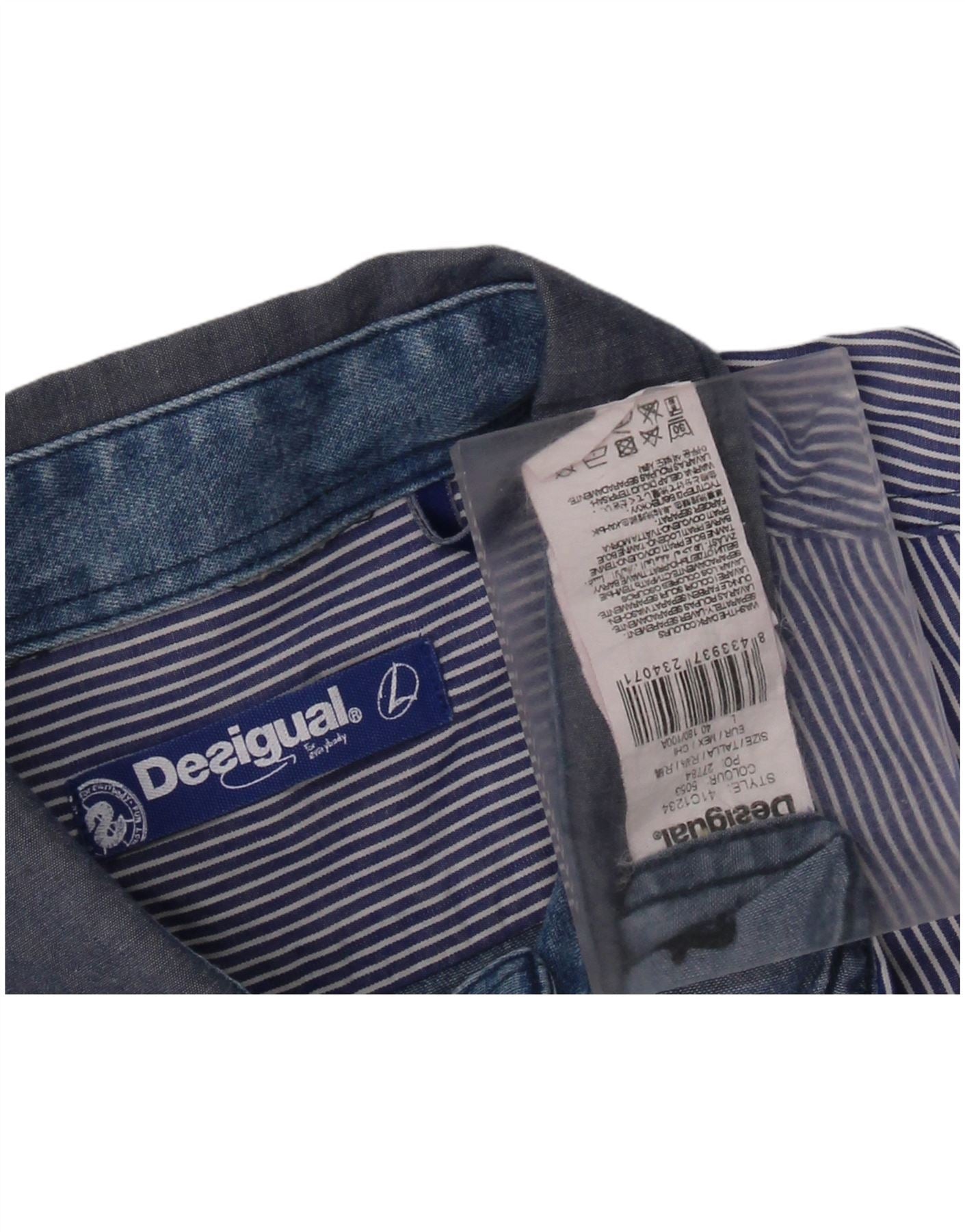 - Opis sztucznej inteligencji: Ta koszula męska Desigual jest wykonana w 100% z bawełny, będącej mieszanką dżinsu i tkaniny w paski. Posiada kołnierzyk i długie rękawy zakończone mankietami zapinanymi na guziki. Regularny krój zapewnia wygodę noszenia. Projekt ma efektowny wzór w paski po jednej stronie, kontrastujący z gładkim niebieskim dżinsem po drugiej. Tonalne guziki zabezpieczają przednie zapięcie. Subtelny detal z logo dodaje rozpoznawalności marki.