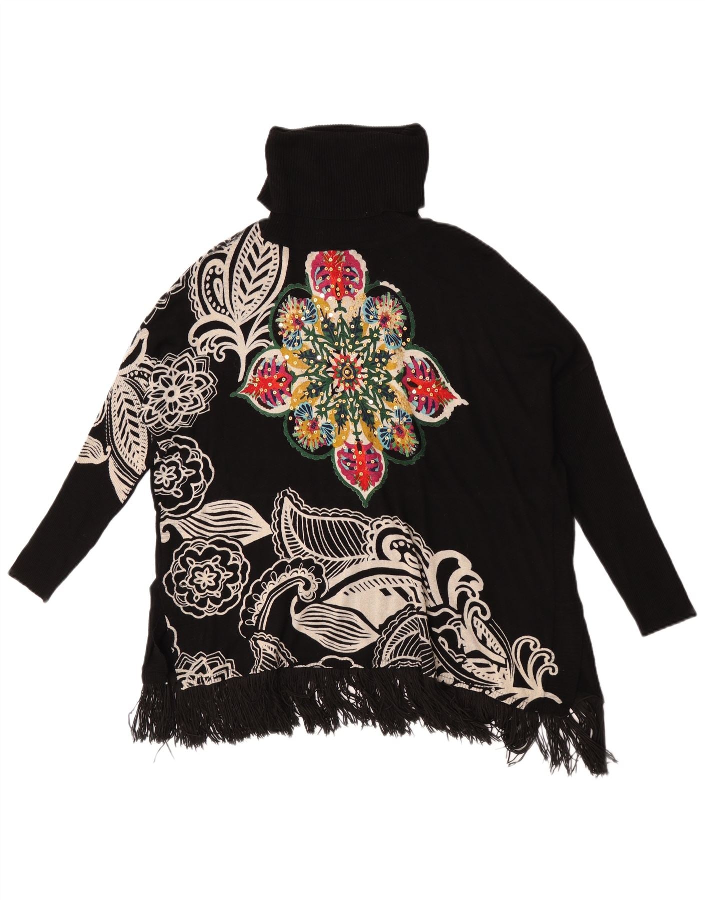- Opis sztucznej inteligencji: Damski sweter Desigual z wywijanym dekoltem jest wykonany z miękkiej mieszanki dzianiny akrylowej. Ma luźny krój typu poncho z wygodną rolowaną szyją. Czarny materiał prezentuje żywy kwiatowy wzór graficzny. Długie rękawy zakończone są schludnymi mankietami. Zabawny detal z frędzlami zdobi dół, dodając artystycznego uroku.