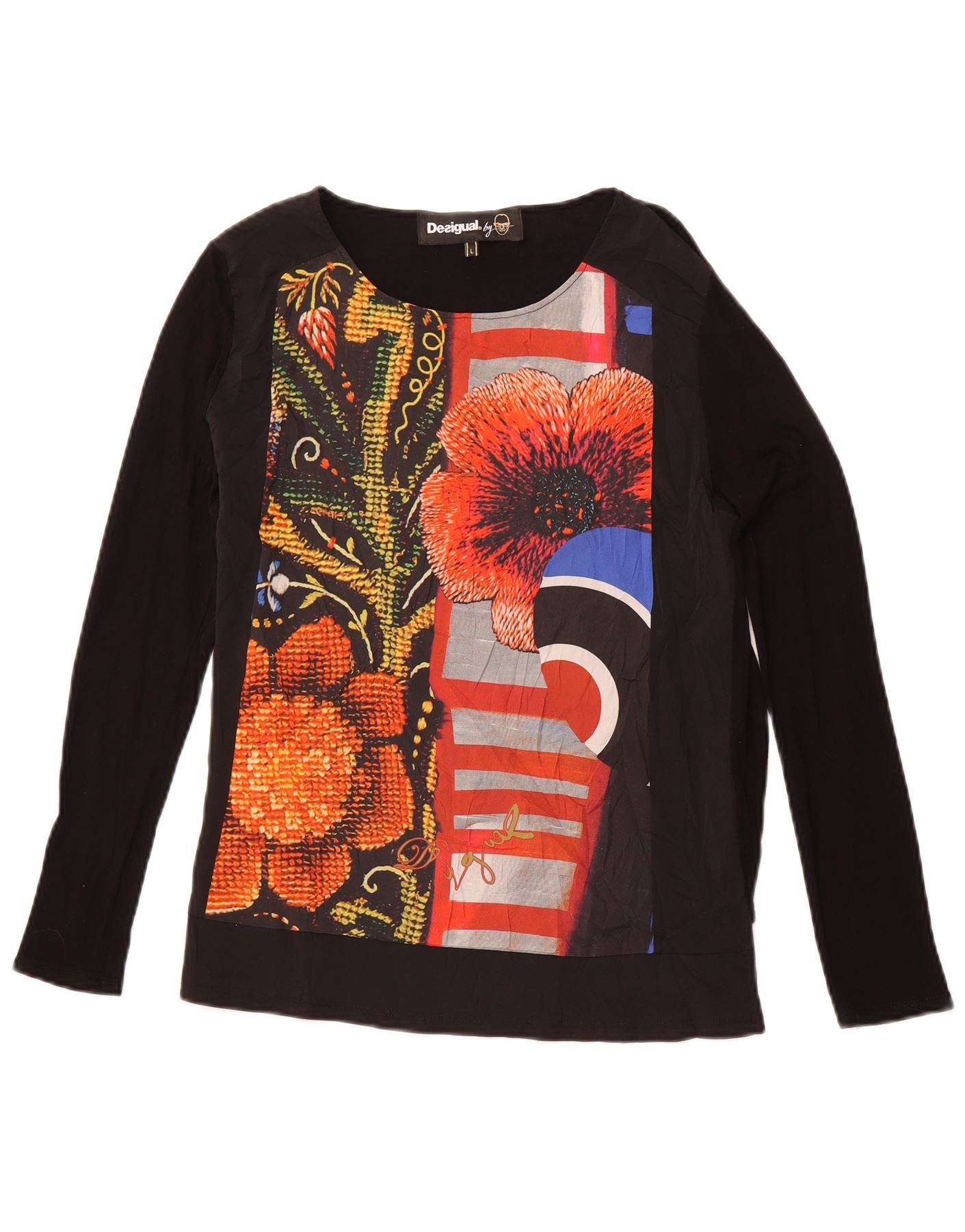 DESIGUAL Damski graficzny top z długim rękawem UK 14, duży, czarny, w kwiaty, wiskoza