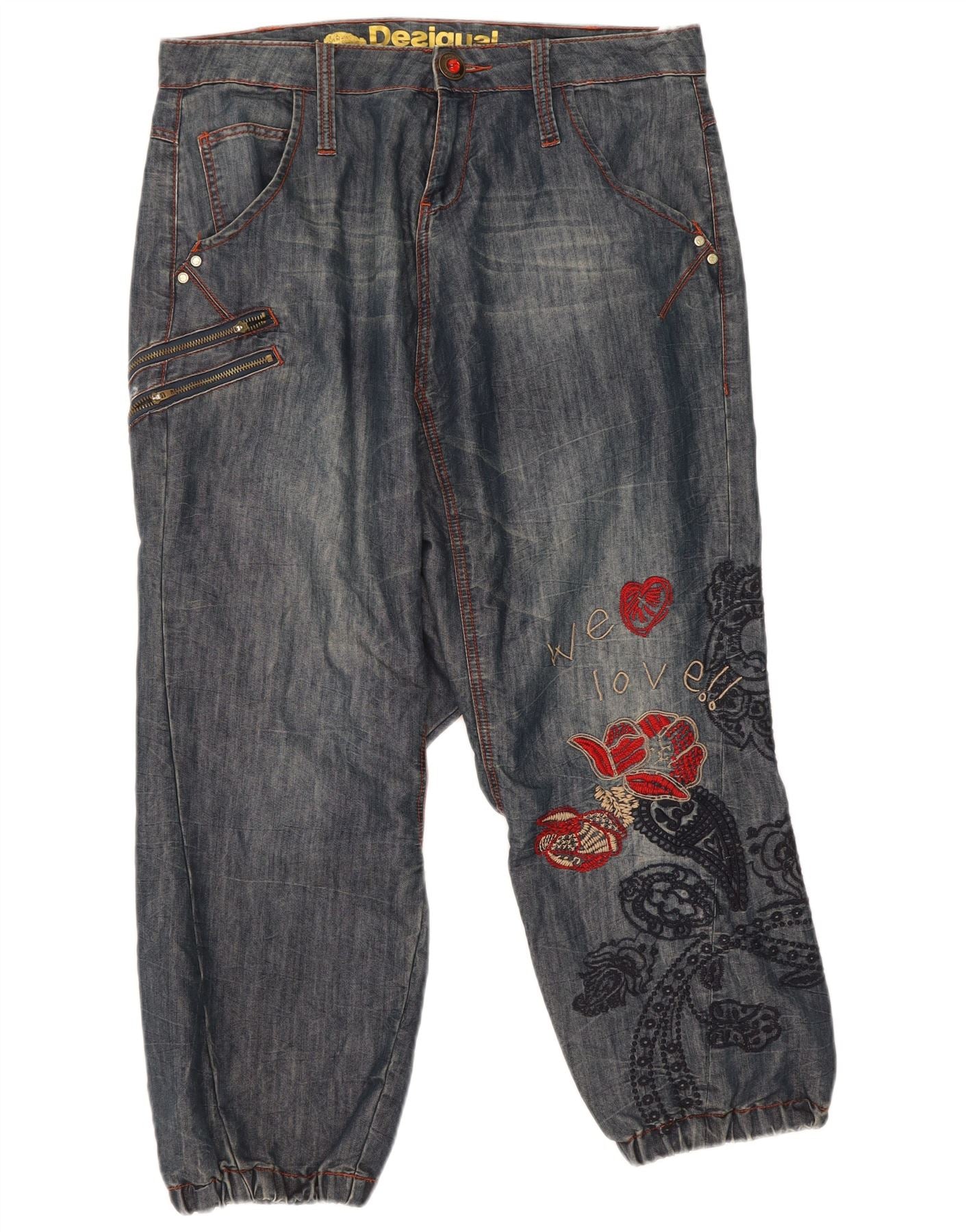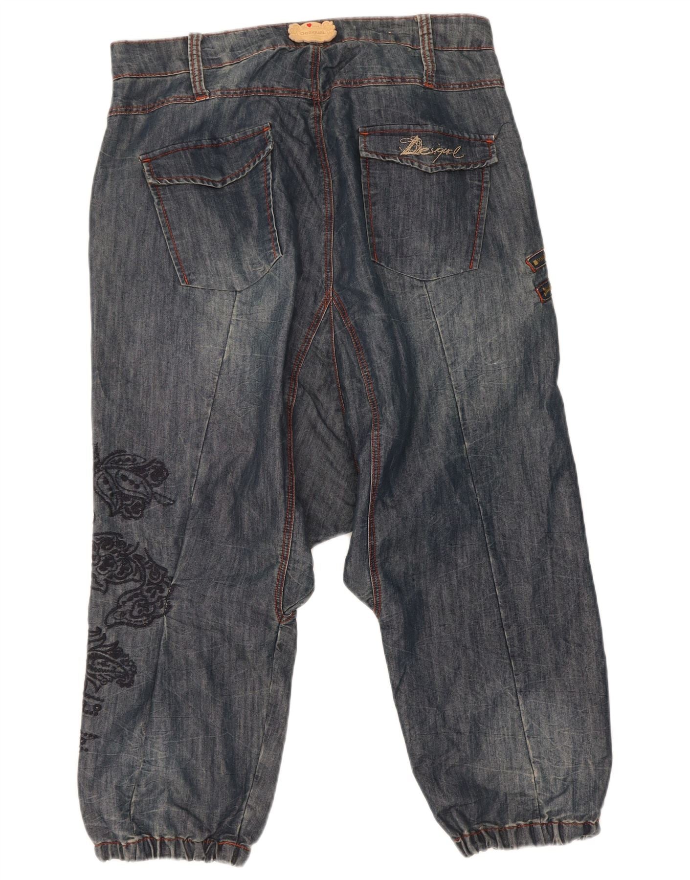 - AI Description: These Desigual women's drop crotch jeans are crafted from a blue denim blend of cotton, polyester, and elastane. They feature a relaxed, loose fit with a comfortable elasticated waist and button closure. Embroidered accents provide a distinctive bohemian flair. Cuffed hems define the contemporary cropped silhouette. Functional pockets offer everyday practicality, blending style with ease.