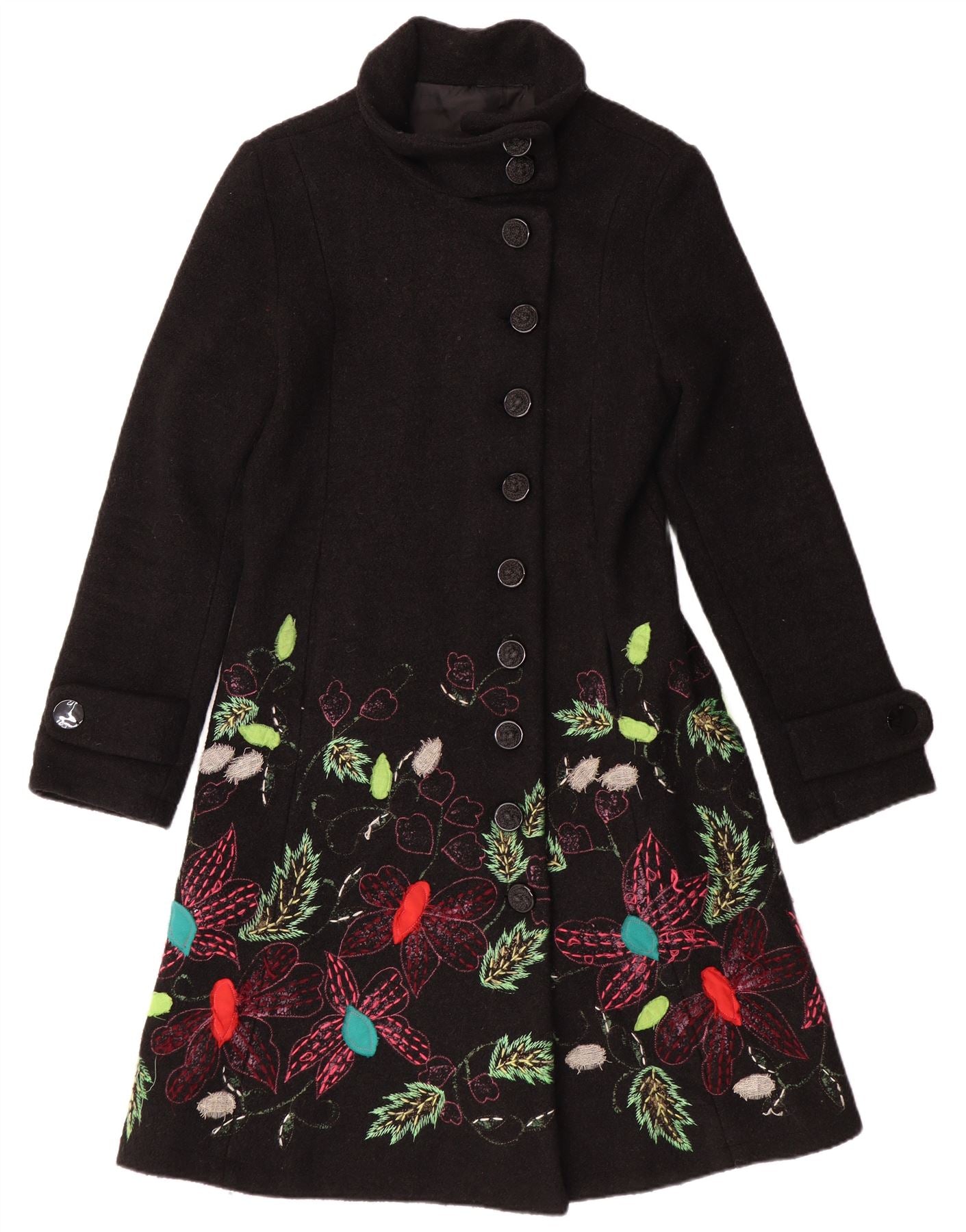 DESIGUAL Damski płaszcz UK 10 Small, czarny, kwiatowy, wiskozowy, artystyczny