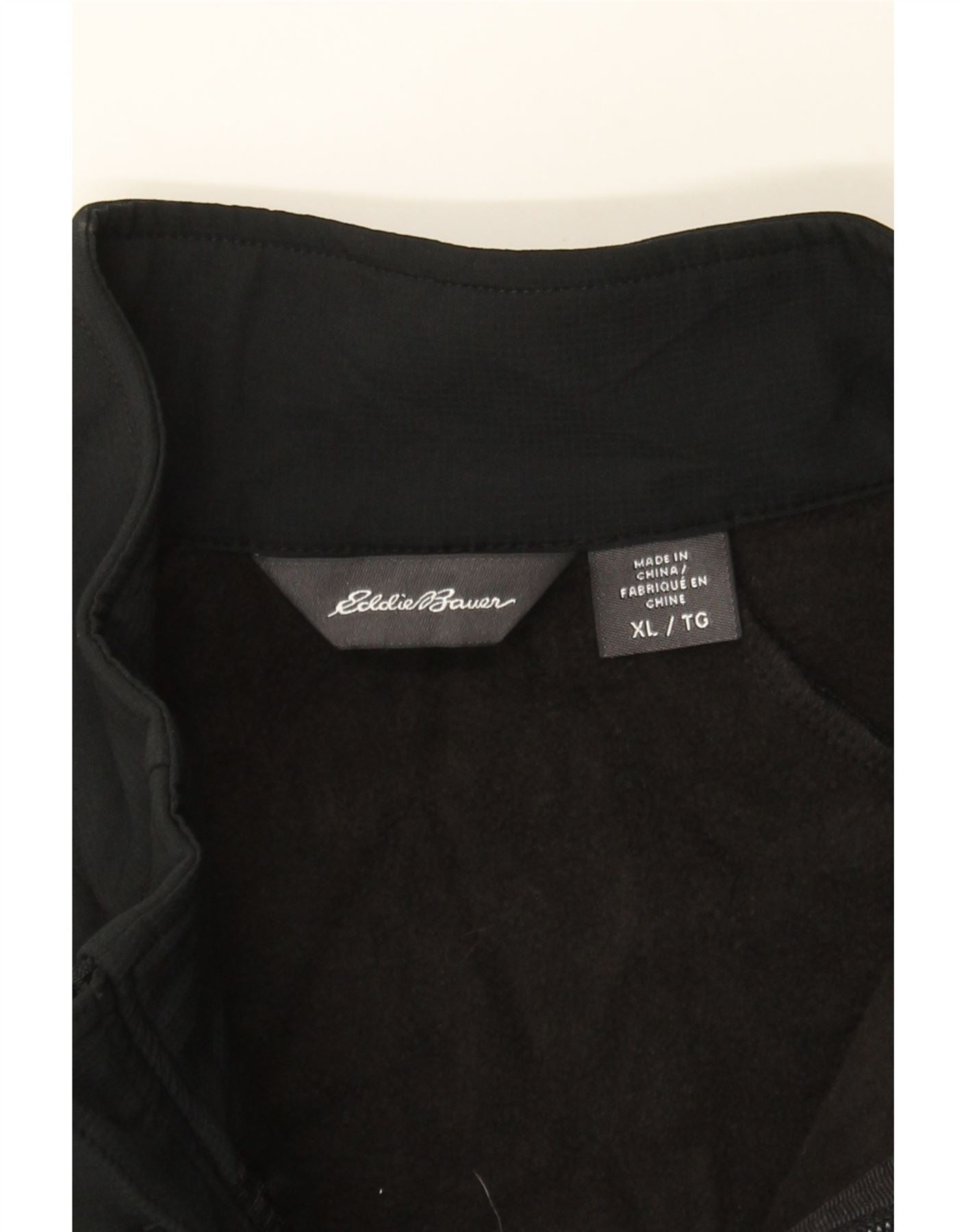- AI Description: This pre-owned Eddie Bauer black fleece waistcoat is a versatile addition to any man's wardrobe. Crafted from 100% polyester fleece, it features a full zip closure and a comfortable regular fit. The sleeveless design and collared neckline make it ideal for layering. Functional zipped pockets add practicality, while the subtle logo accent provides a touch of branding. Perfect for casual wear, this XL waistcoat can be easily cared for with a cold machine wash. Made in China.