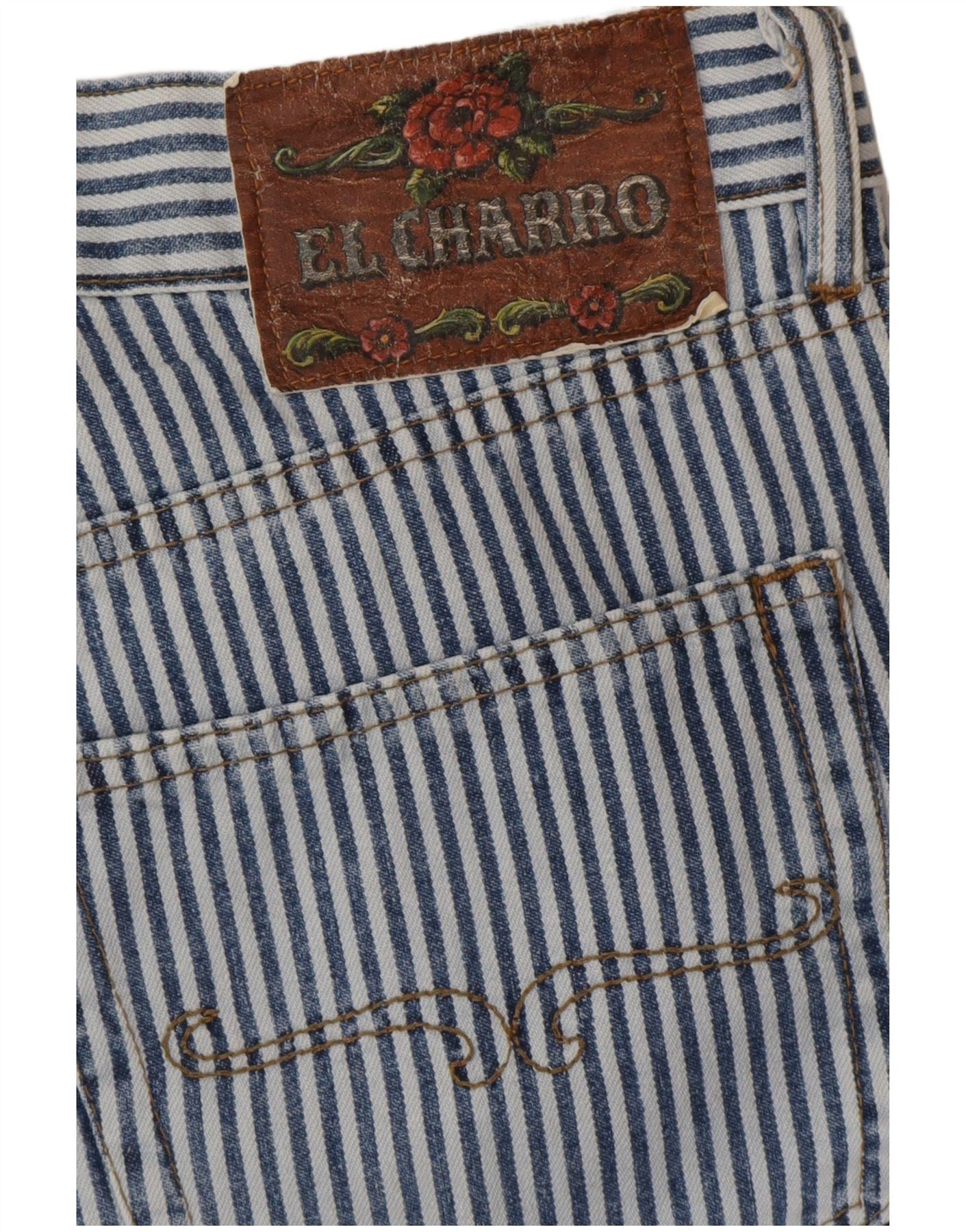 - Opis sztucznej inteligencji: Te damskie jeansy El Charro o skróconym kroju są wykonane z dżinsu w niebiesko-białe paski. Mają średni stan i zapięcie na guziki. Luźny krój zapewnia wygodę noszenia. W komplecie znajdują się klasyczne kieszenie, a z tyłu w pasie znajduje się naszywka z logo marki. Krótka długość zapewnia styl retro.
