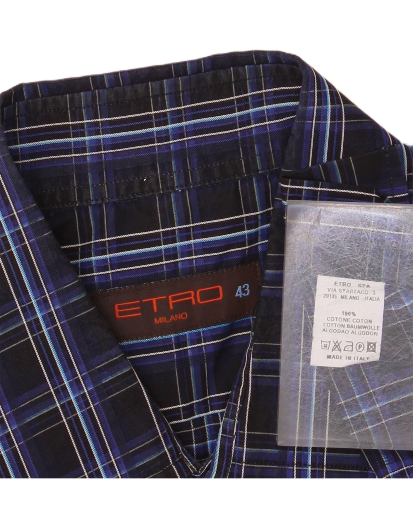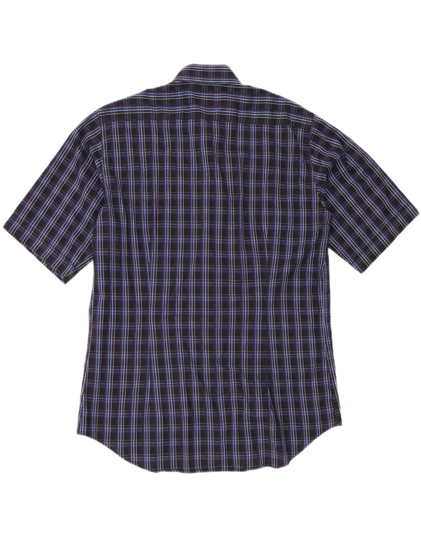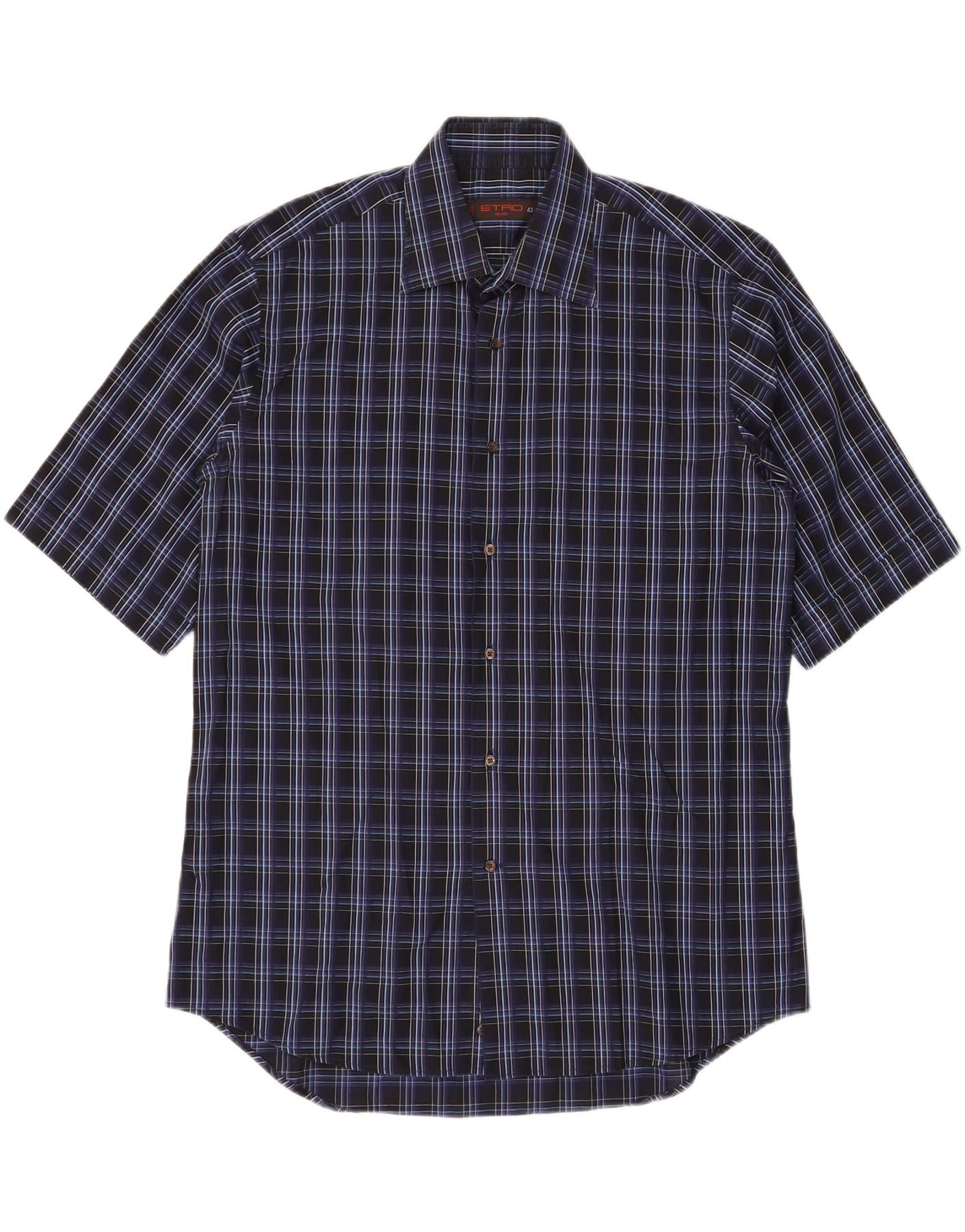 ETRO Mens Milano Short Sleeve Shirt Size 43 Large Navy Blue Check Cotton