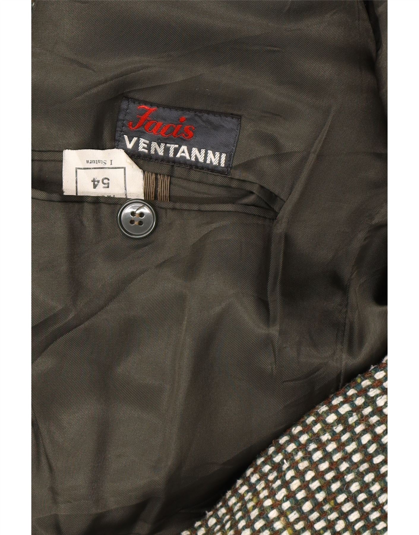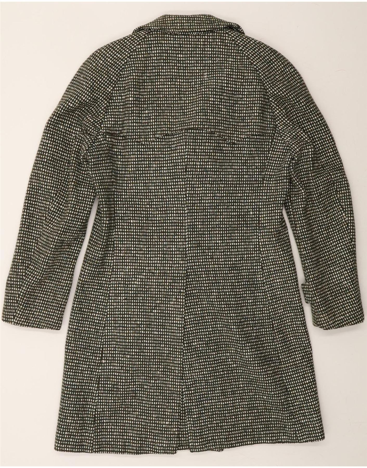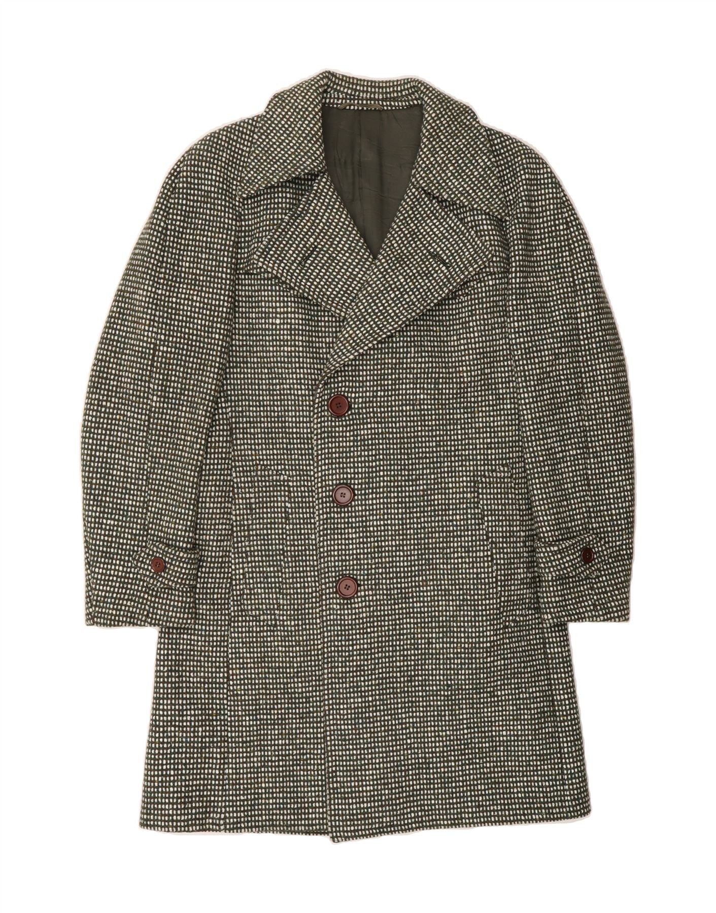 - AI Description: This vintage men's overcoat offers classic style in a grey houndstooth tweed. Featuring a double-breasted button closure, long sleeves and collared neckline. The regular fit coat, labelled size 54, is fully lined and includes practical pockets. A timeless piece with button accents. Pre-owned in excellent condition, displaying minor overall wear and tear.