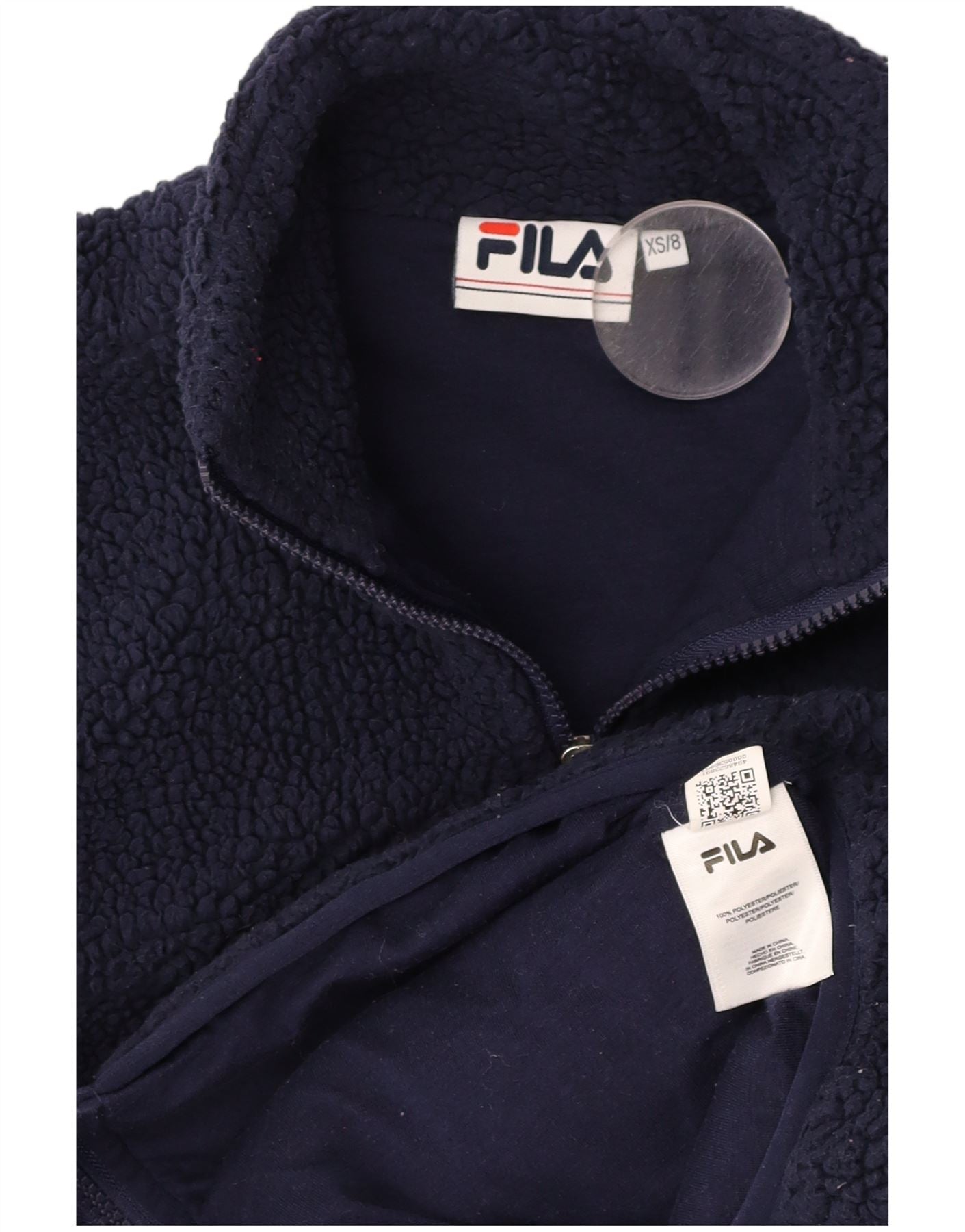 Home > Damskie > Odzież Depopa > Damska, oversize'owa kurtka polarowa FILA z grafiką UK 6 XS, granatowa, poliestrowa