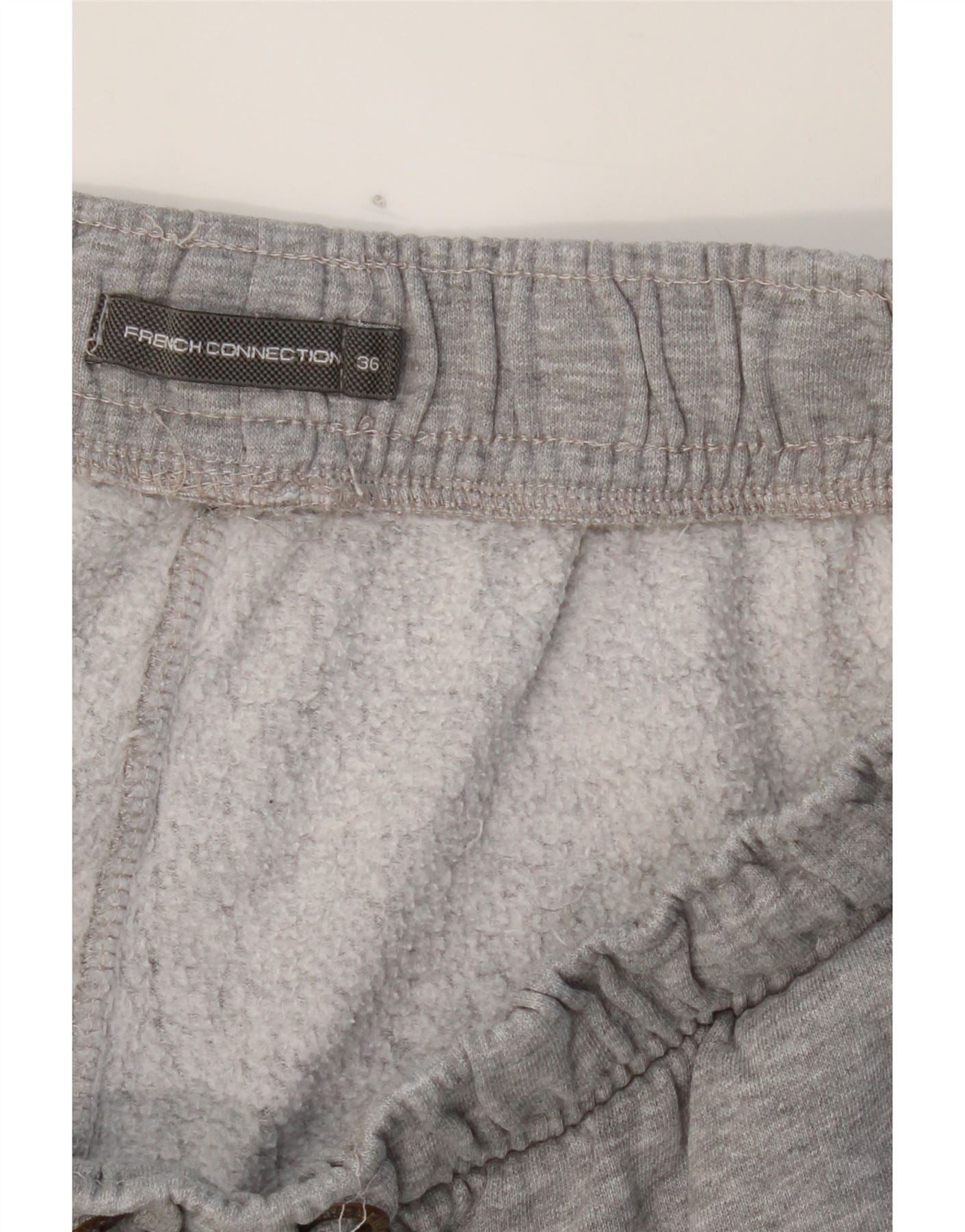 - AI Description: These pre-owned grey lounge shorts from French Connection are perfect for casual wear. Crafted from a soft fleece fabric blend of 50% cotton and 50% polyester, they feature a comfortable regular fit with an elasticated drawstring waist for an adjustable fit. The shorts include practical pockets and subtle logo detailing. Size 36.