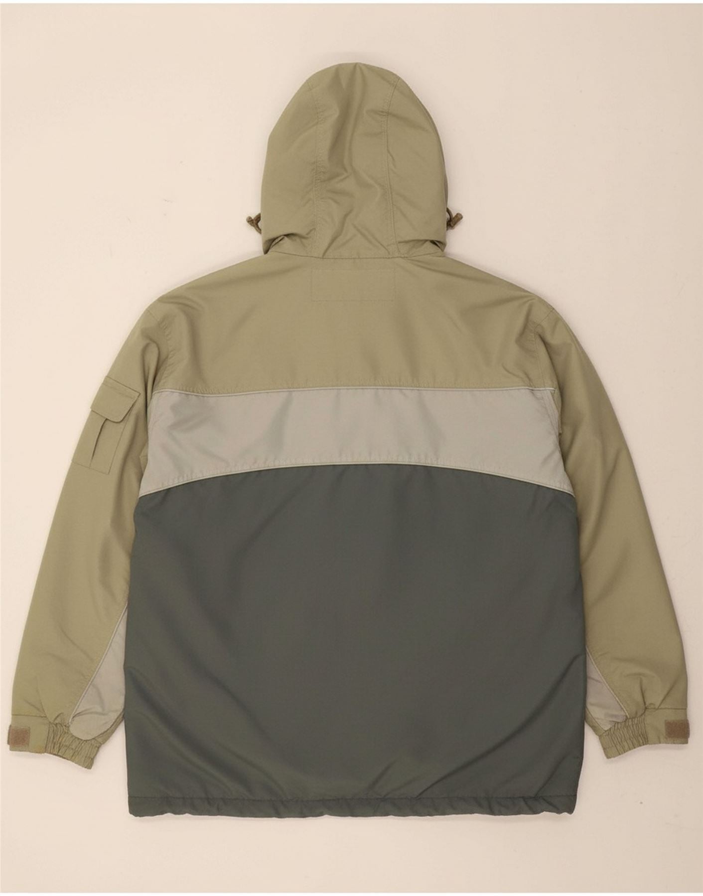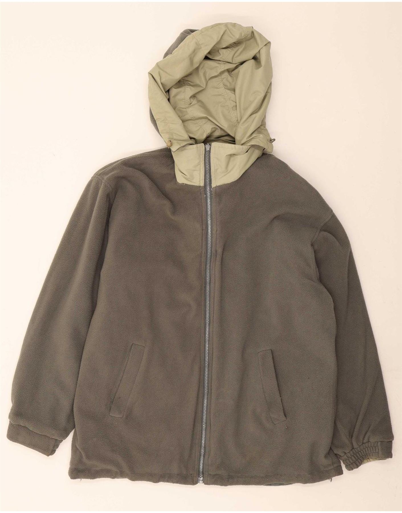 - AI Condition: Pre-owned | grade: Moderate | location: On the beige fabric of the right sleeve cuff | type: Stains | grade: Minor | location: General pilling and wear on the fleece material | type: Visible wear