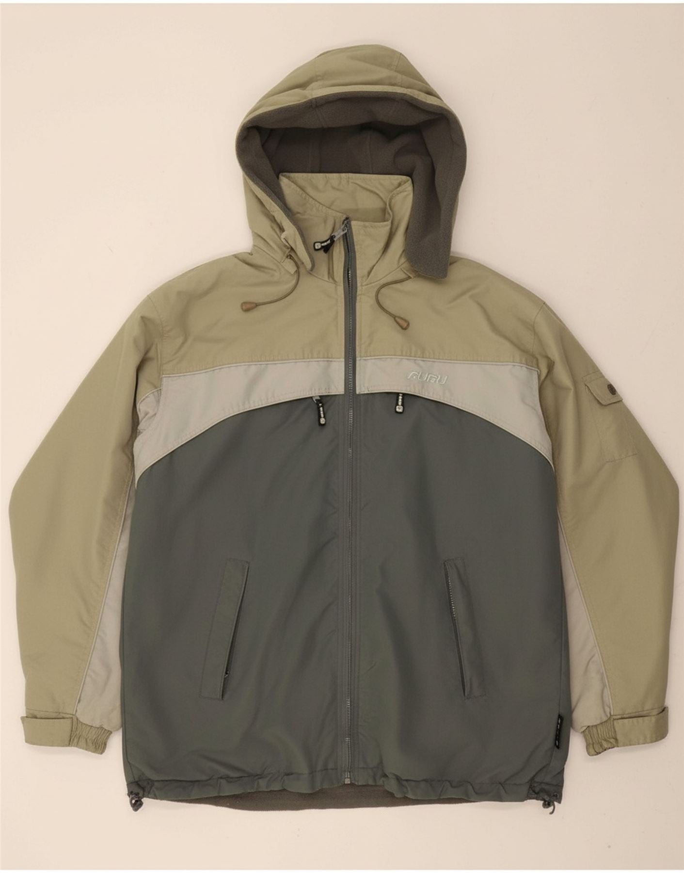 - AI Description: This Fubu mens reversible jacket offers two distinct looks. One side features a woven blended fabric in a dynamic colourblock pattern, while the reverse is a soft microfleece. It boasts a regular fit with long sleeves and a high neck. A full zip closure extends to the practical hood. Zipped pockets and an elasticated waist add functionality. This versatile jacket is perfect for changing styles effortlessly.