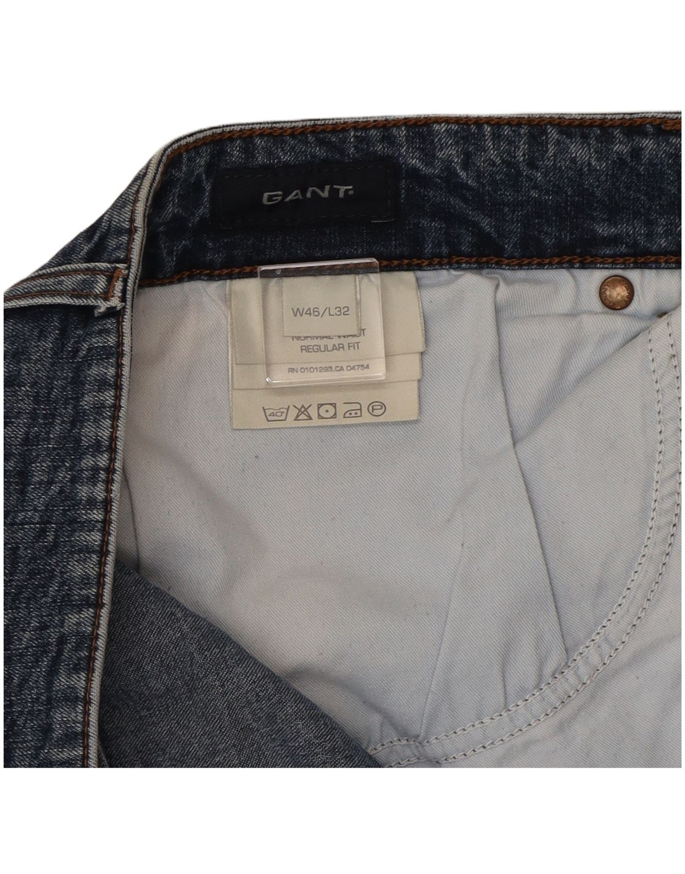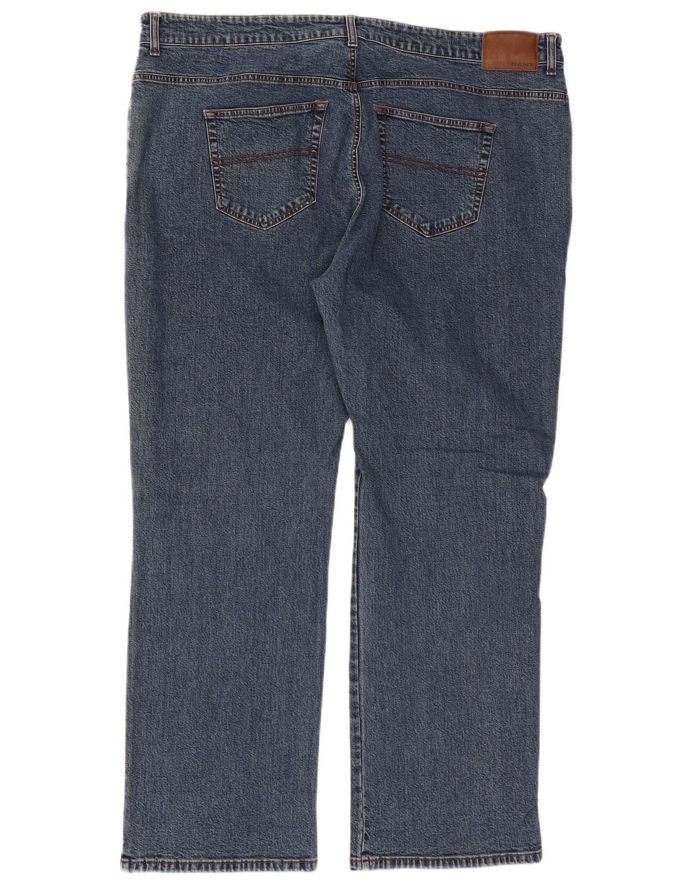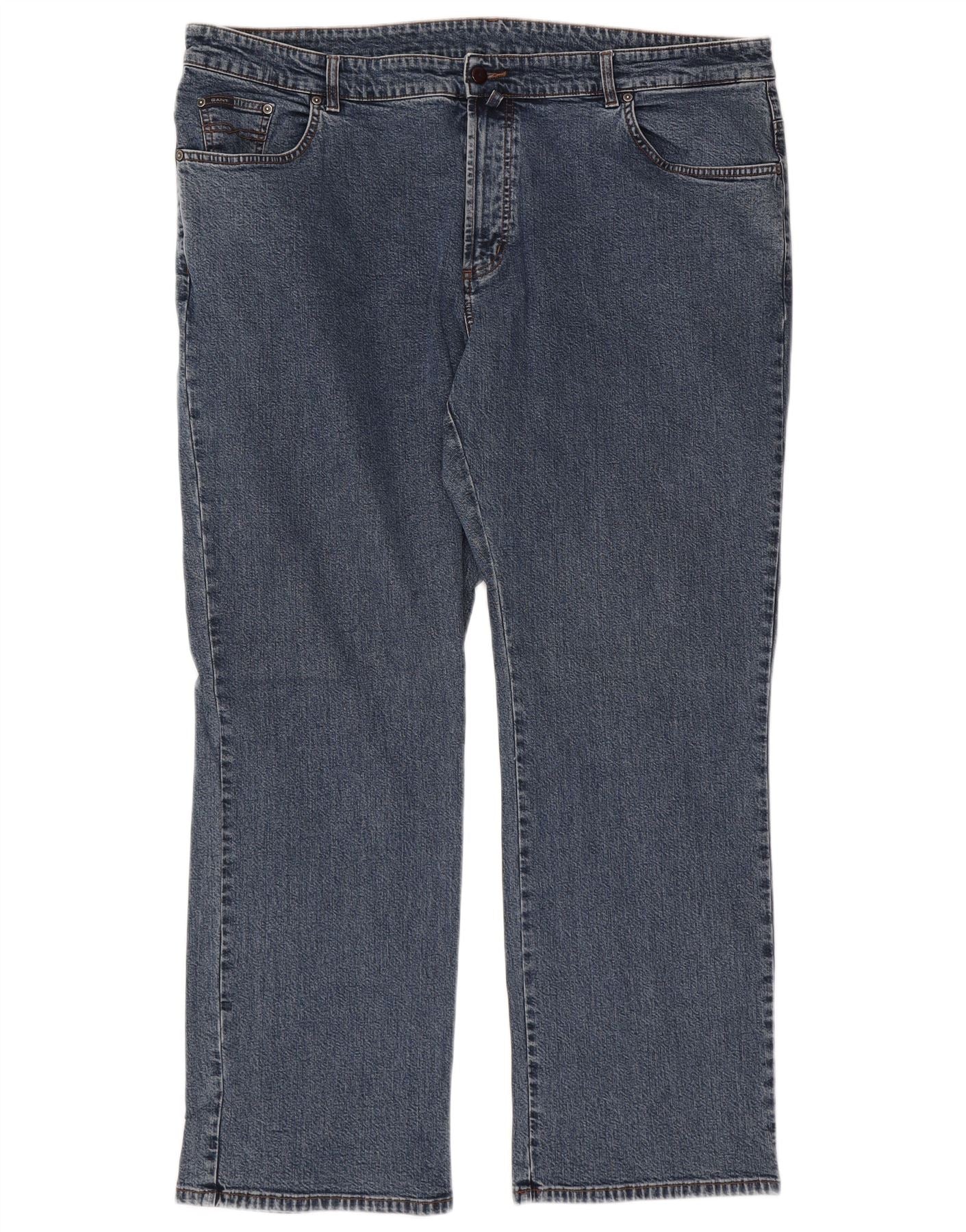 - AI Description: These Gant men's straight jeans are crafted from blue denim, offering a classic, durable texture. They feature a regular fit for comfort and a straight leg silhouette. The zip closure ensures a smooth front, complemented by practical pockets. Subtle button accents add a refined touch to the design.