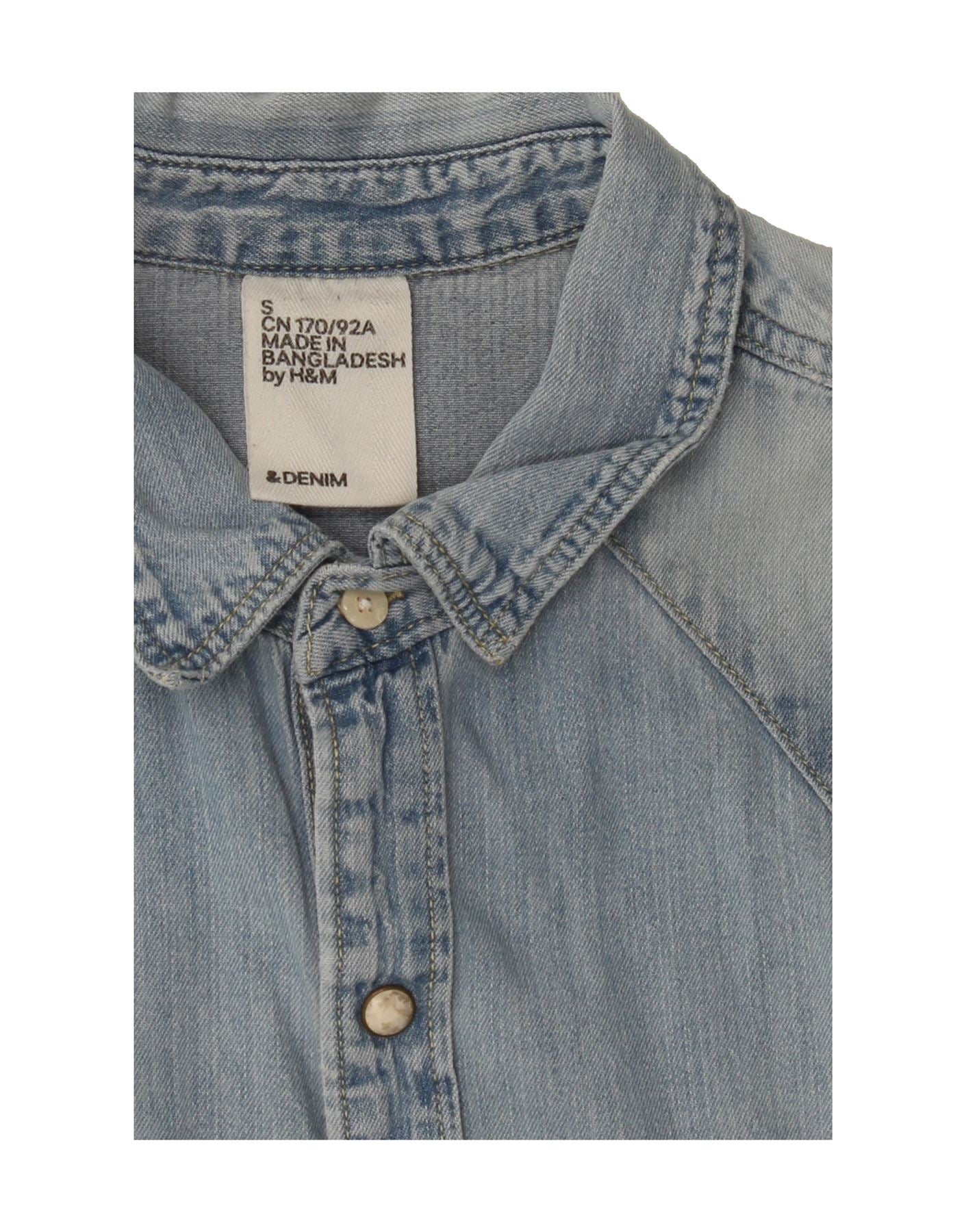 - AI Description: This pre-owned H&M denim shirt is a versatile addition to any man's wardrobe. Crafted from quality denim in a blue hue, this long-sleeved shirt features a collared neckline and a regular fit for comfortable, casual wear. The button closure and pockets add practicality. While in excellent condition, there is minor overall fading and slight discoloration around the collar. Size S. Made in Bangladesh.