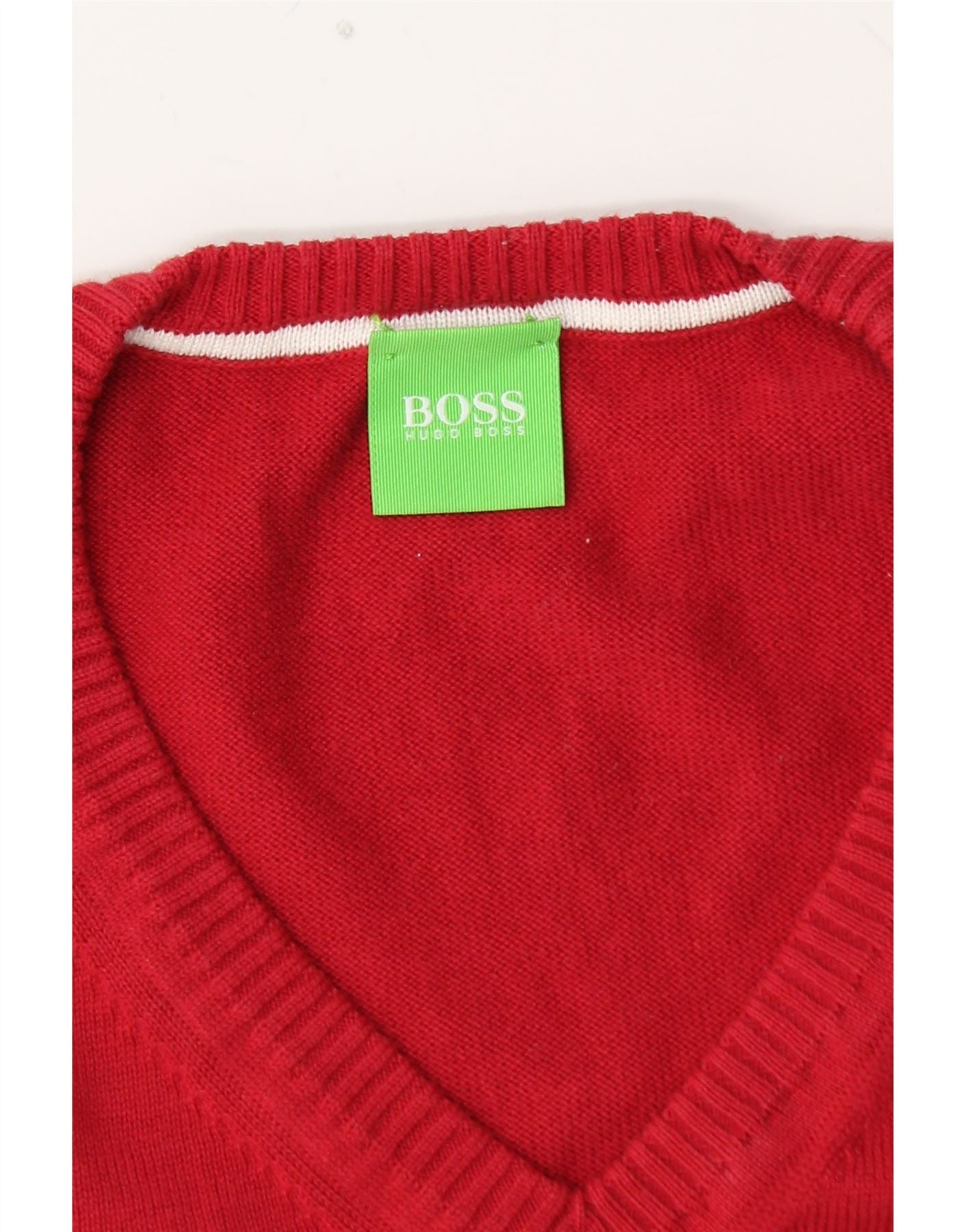 Męski sweter HUGO BOSS z graficznym dekoltem w kształcie litery V, duży, czerwony, z blokami kolorów