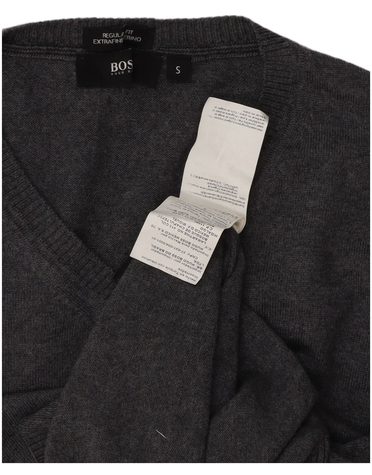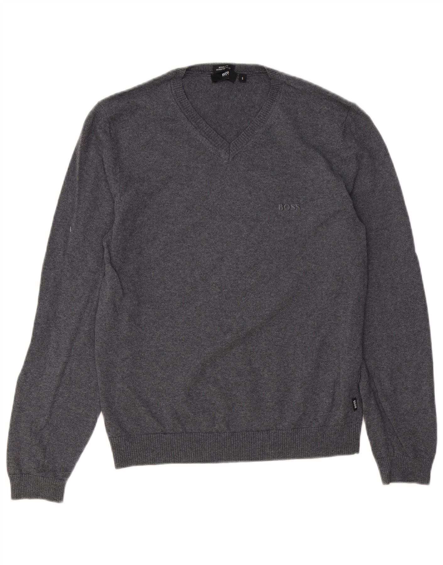 Męski sweter HUGO BOSS o regularnym kroju z dekoltem w kształcie litery V, mały, szary, z dziewiczej wełny