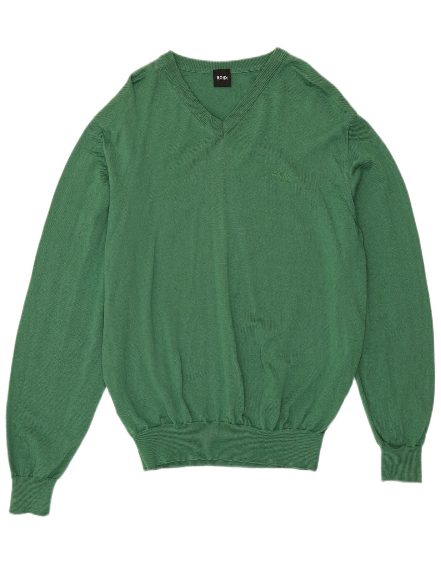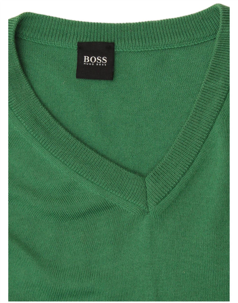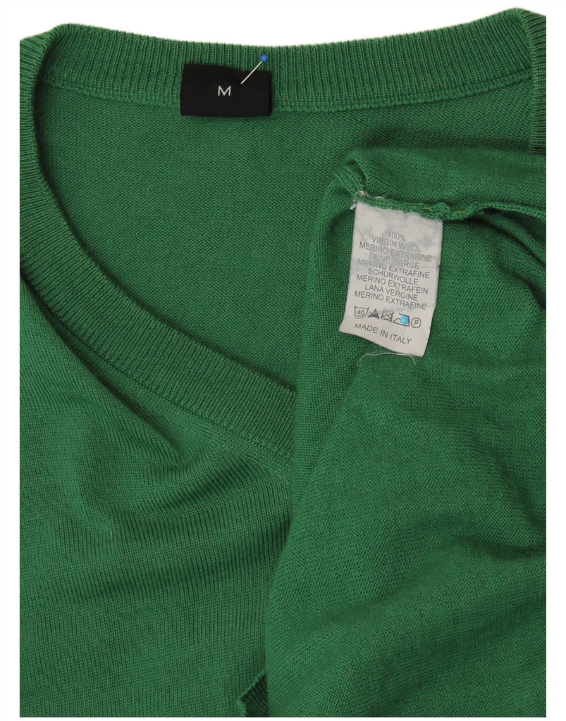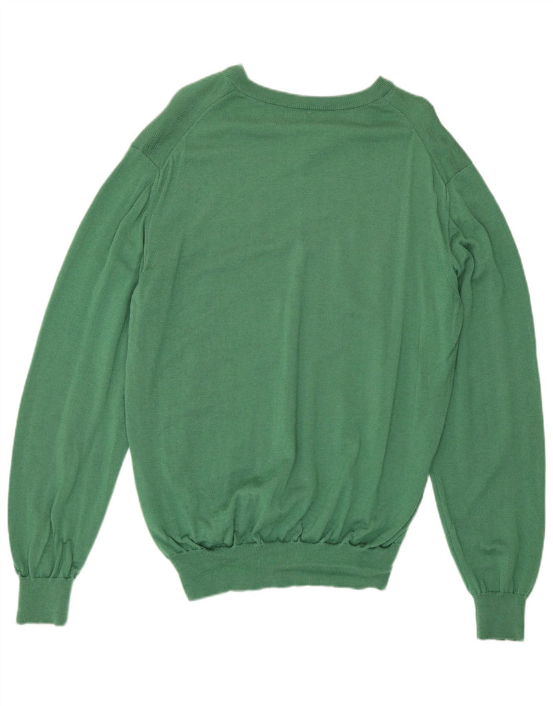 Męski sweter z dekoltem w kształcie litery V, średniej wielkości, z wełny merynosów, w kolorze średniej zieleni