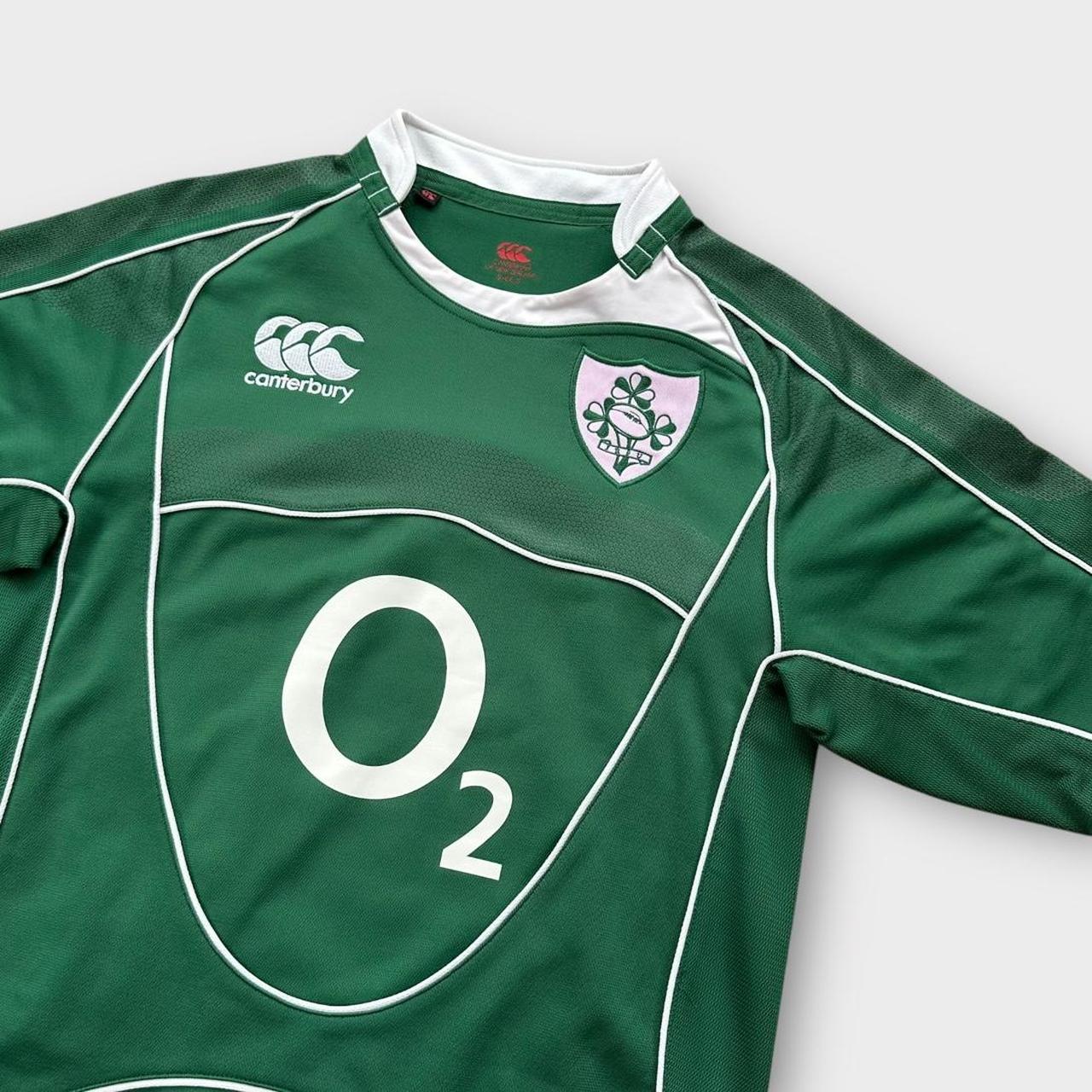 Koszulka do rugby w Irlandii z początku XXI wieku marki Canterbury z haftowanymi logo i sponsorem na piersi