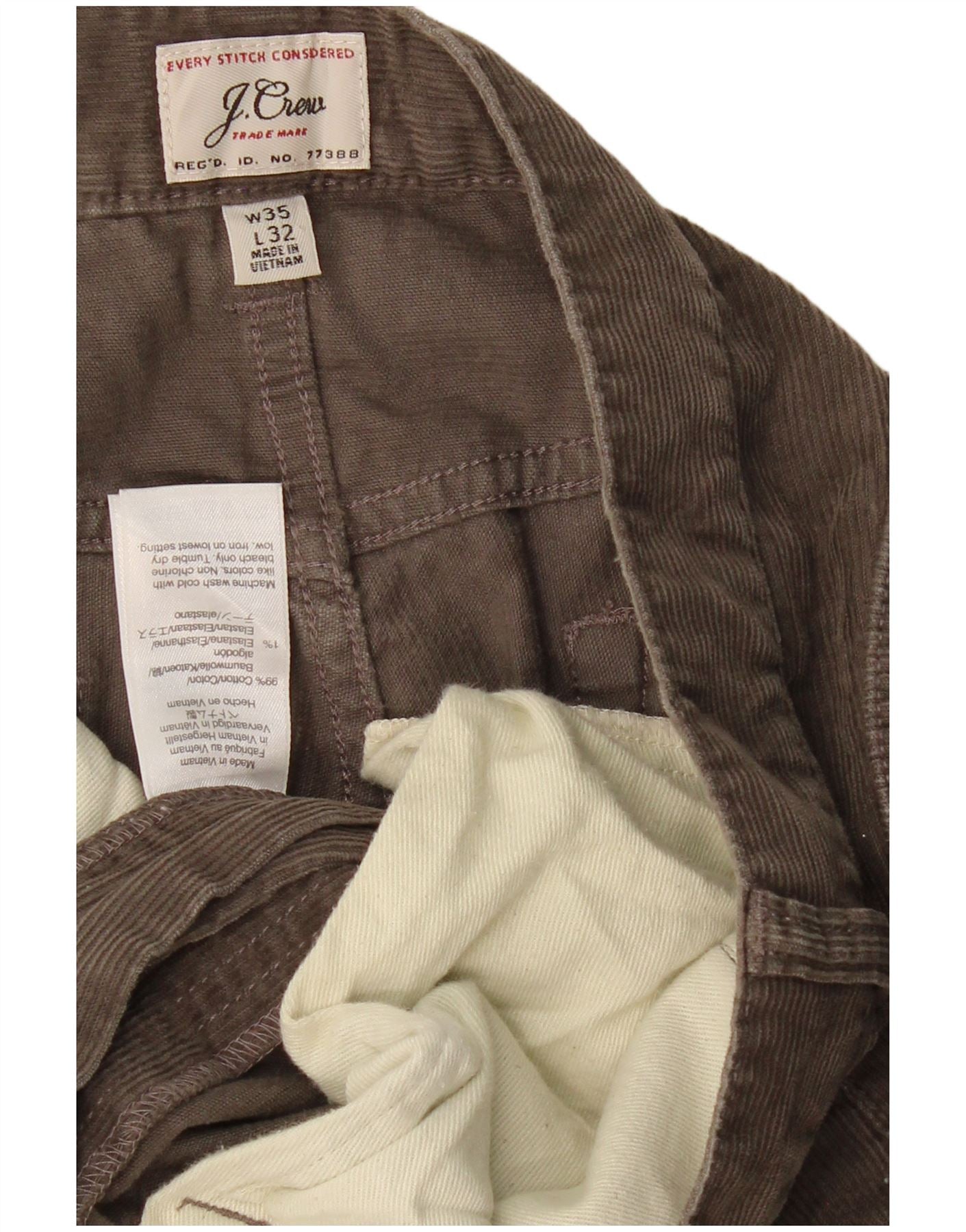 - AI Description: This J. Crew men's Corduroy Trousers are crafted from a rich brown cotton blend corduroy. The fabric offers a soft texture with a subtle ribbed finish. They feature a classic button closure and a comfortable regular fit through the leg. Practical pockets are included for everyday utility. This timeless style provides both comfort and a smart casual aesthetic.