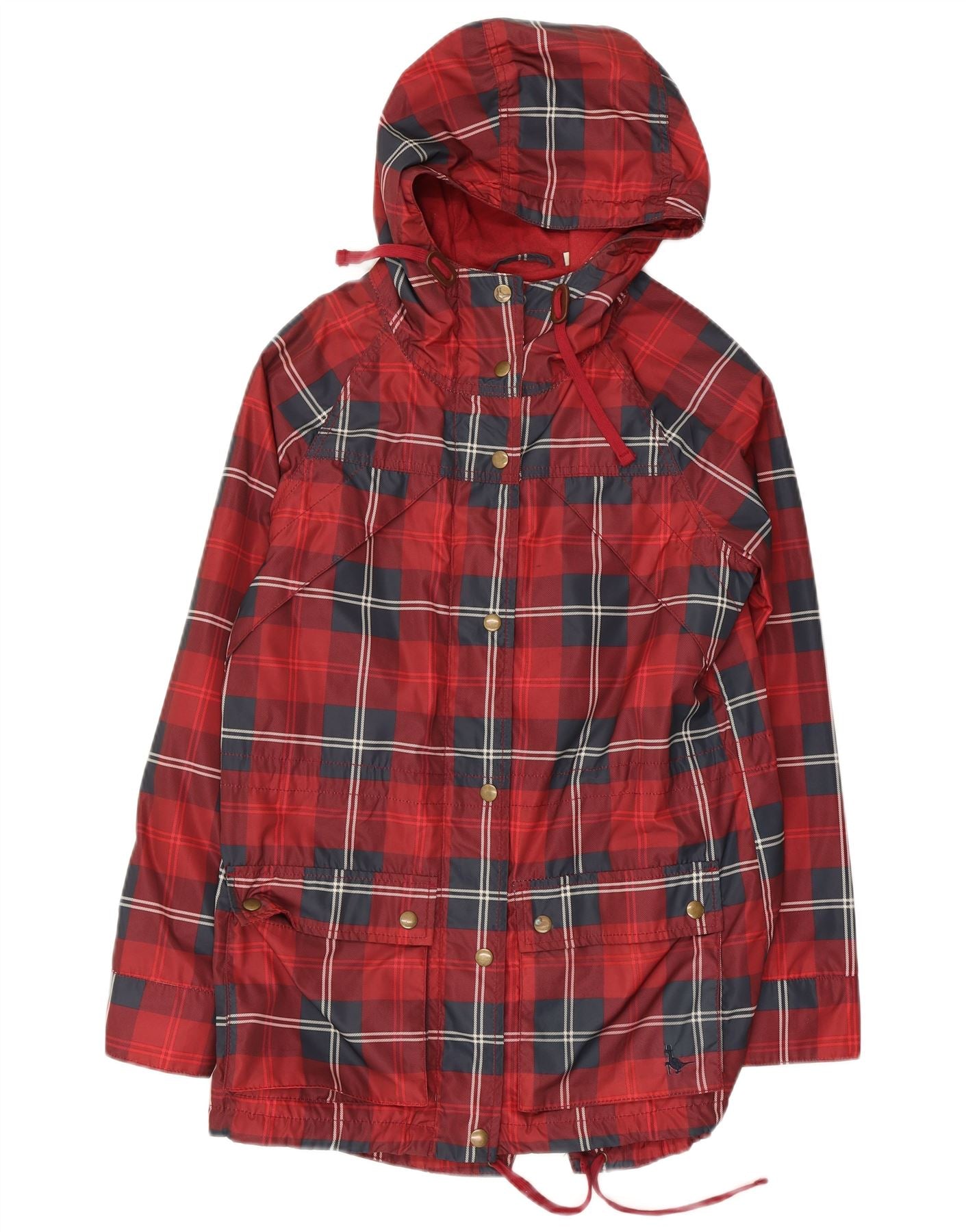JACK WILLS Damska, obszerna kurtka przeciwdeszczowa z kapturem UK 6 XS, poliester w czerwoną kratę