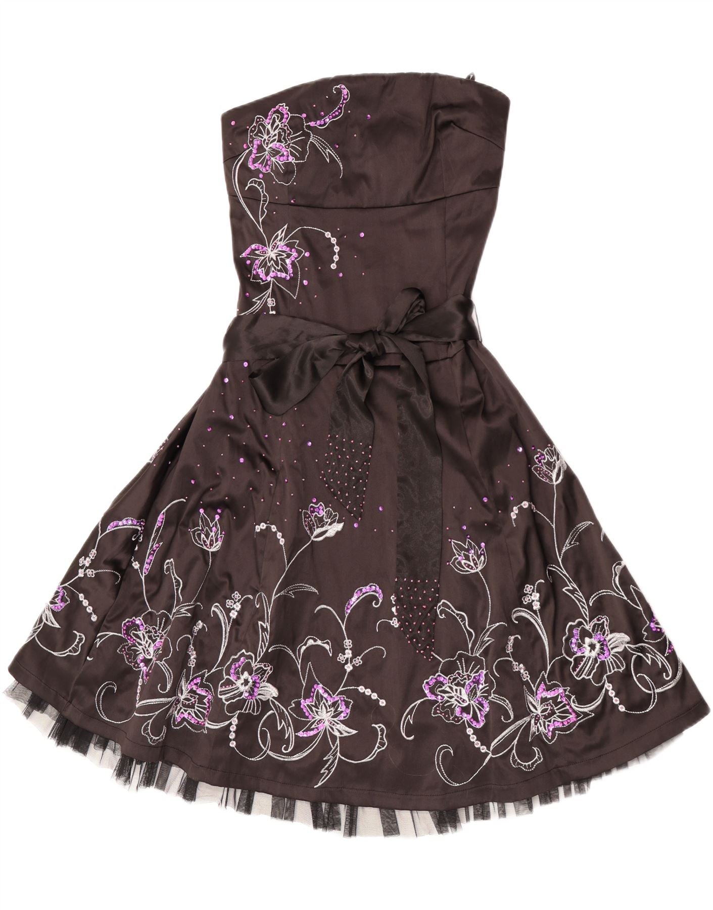 - Opis sztucznej inteligencji: Ta damska sukienka bez ramiączek Jane Norman jest wykonana z czarnej satyny poliestrowej, która zapewnia gładkość, luksus i subtelną rozciągliwość. Stanik bez ramiączek zapewnia czystą, elegancką sylwetkę. Pasek w talii podkreśla sylwetkę, tworząc spódnicę o regularnym kroju. Zamek błyskawiczny z tyłu zapewnia bezpieczne dopasowanie. Charakteryzuje się misternym haftem kwiatowym w kontrastującym kolorze fioletowym i białym, który dodaje delikatnych detali. Spódnica ma podszewkę, a u dołu domieszka przezroczystego materiału.