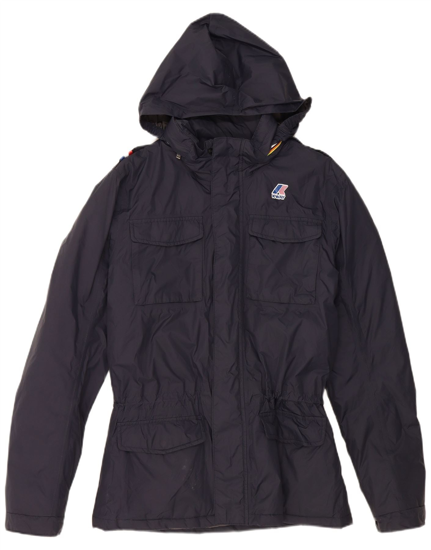 - AI Description: This K-Way mens parka jacket is crafted from durable navy blue polyamide, offering a woven, padded texture. It features a practical zip closure and a comfortable regular fit. The design includes a protective hood and functional pockets for everyday utility. An adjustable waist allows for a custom silhouette. A subtle logo accent completes this modern, long-sleeved garment.