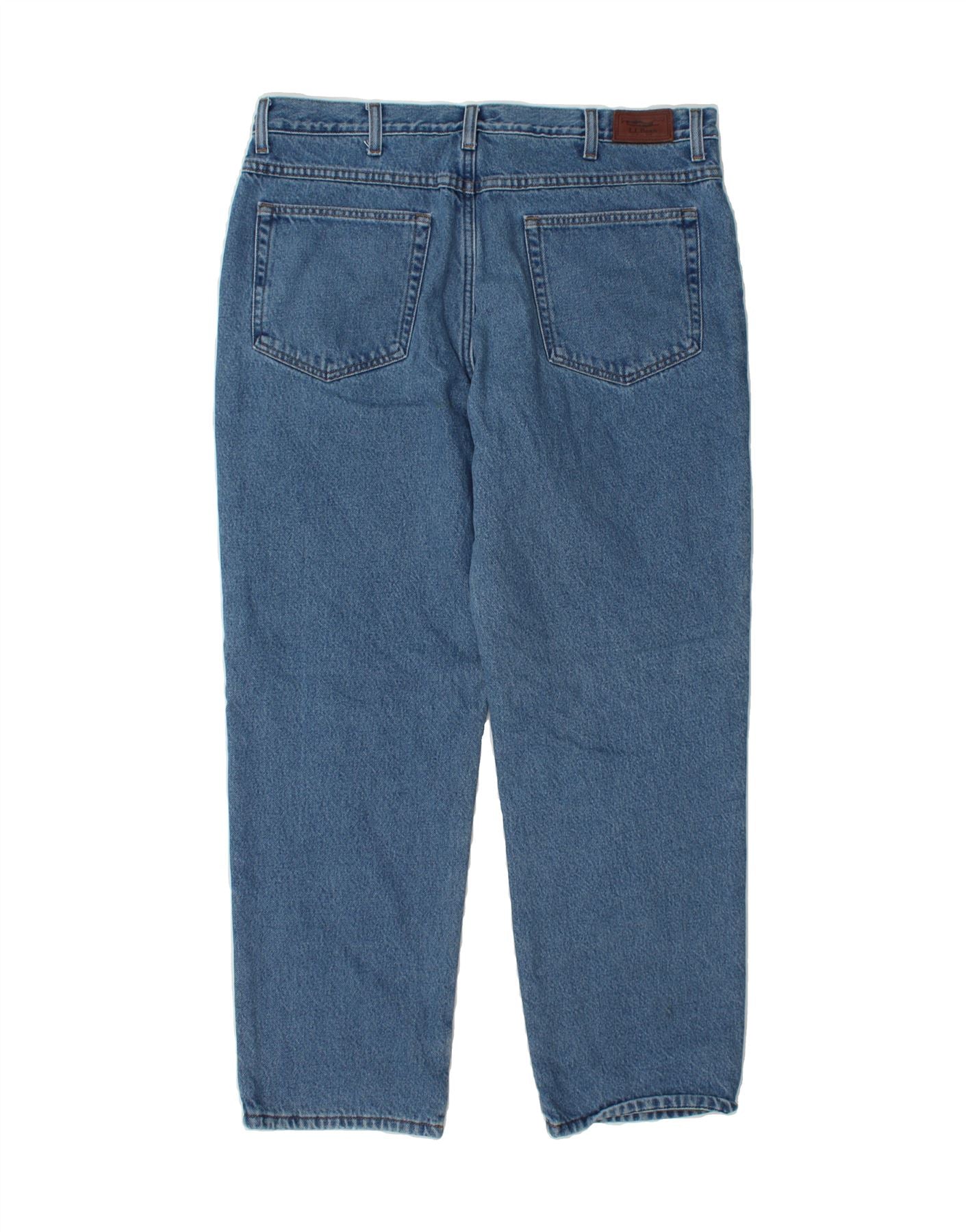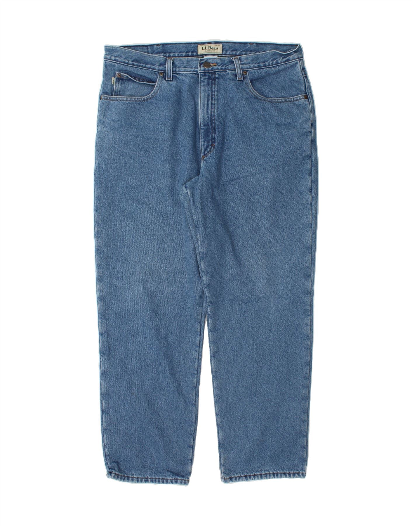 - AI Description: L.L.Bean men's classic jeans in pre-owned excellent condition. Crafted in Mexico from durable blue denim, these regular fit jeans feature a button closure and practical pockets. The shell is 100% cotton, with a 100% polyester lining. Accented with a button and potentially a logo, buckle or pleats. Care instructions are on reverse. Label size 37X30.