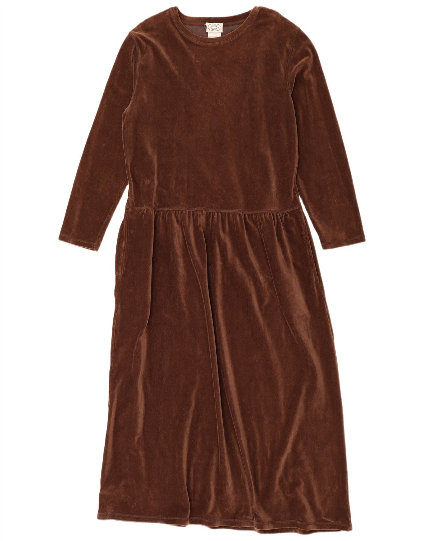 - AI Description: This Laura Ashley womens dress is crafted from luxurious brown velvet, offering a soft, rich texture. It features a classic round neck and long sleeves. The pullover style ensures ease of wear. A relaxed fit provides comfortable movement. An elastic waist subtly defines the silhouette. This classic design is enhanced by the plush velvet fabric.