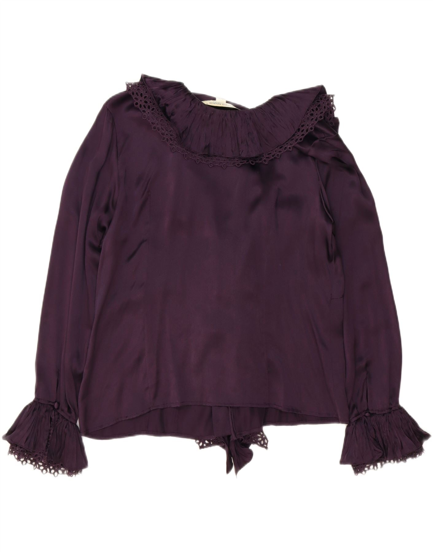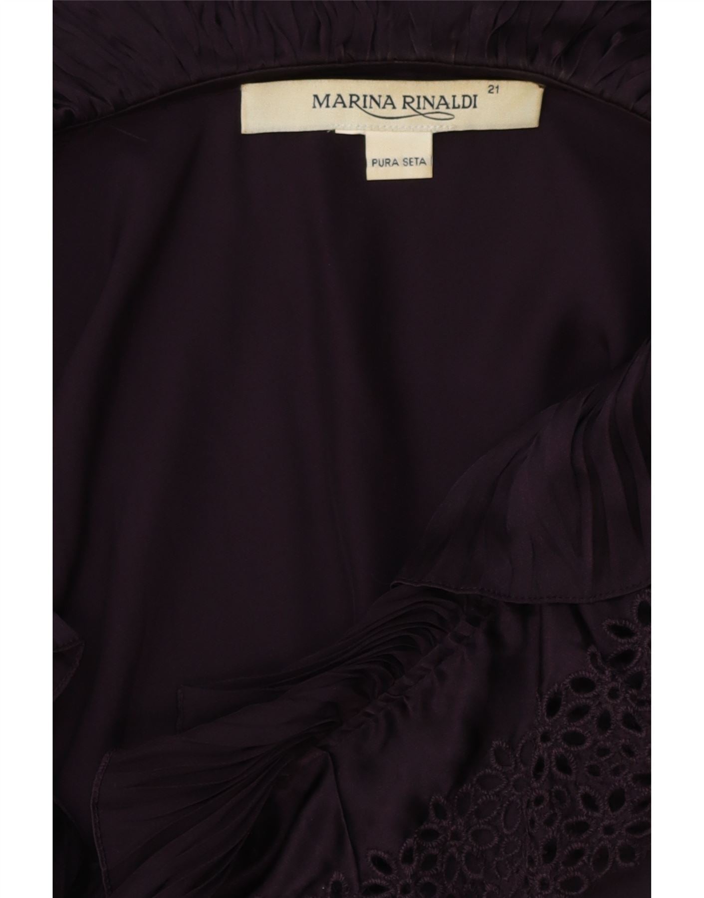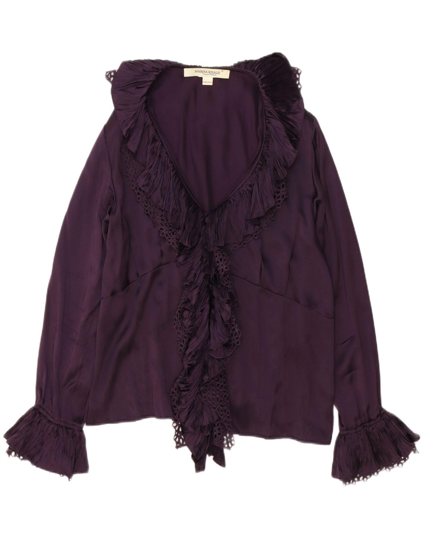 - AI Description: This Marina Rinaldi womens blouse top is crafted from luxurious pure silk satin. Its rich burgundy hue adds sophistication. The V-neckline leads to an elegant front tie closure. Long sleeves complete the regular fit silhouette. Delicate ruffle accents enhance the design. This piece offers both comfort and refined style.