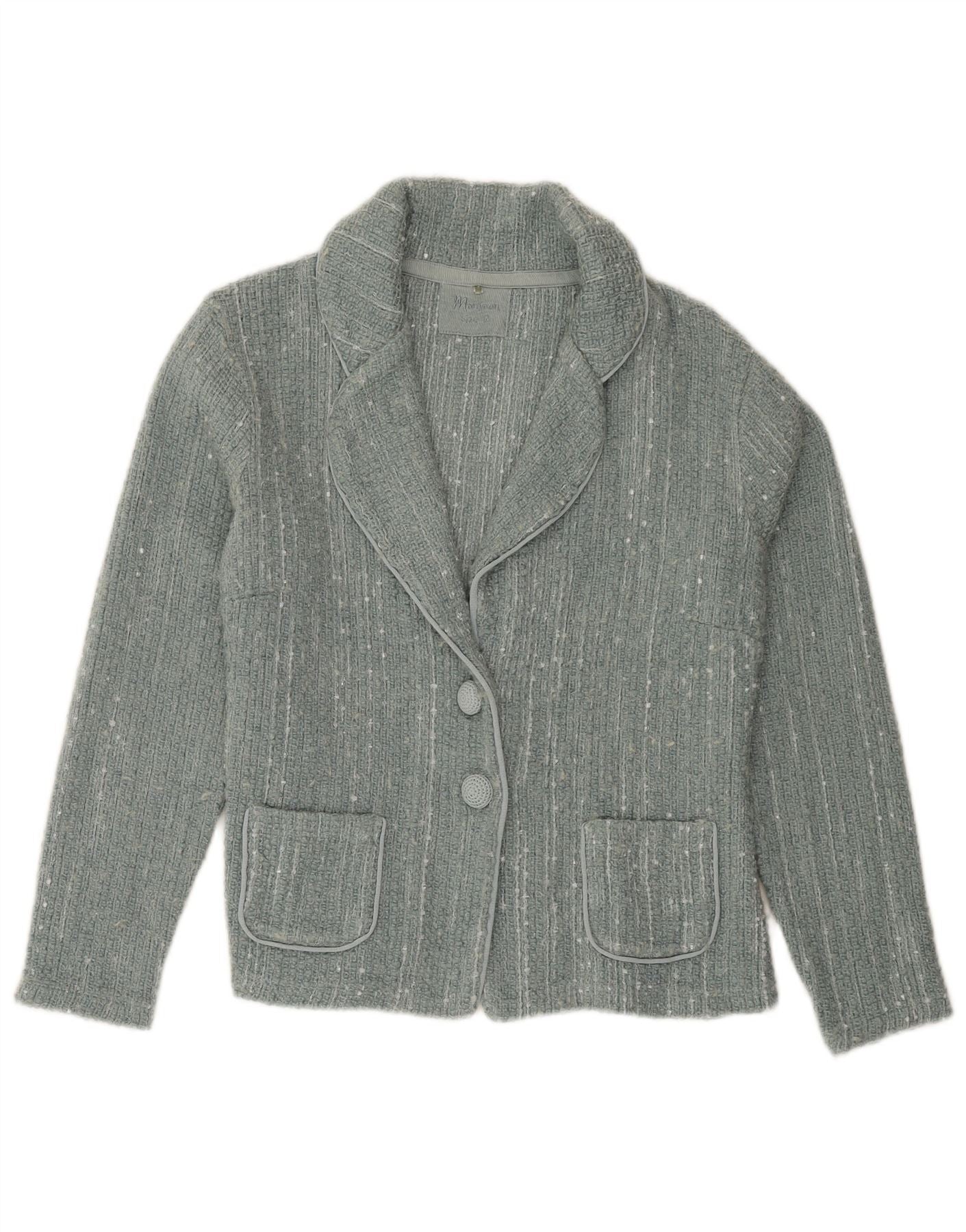 - AI Description: This Monsoon womens blazer jacket is crafted from a luxurious acrylic, wool, and nylon blend. Its knitted texture offers warmth and a soft feel. The vibrant turquoise hue adds a sophisticated pop of colour. It features a classic collared neckline and long sleeves. The regular fit ensures comfortable wear. A two-button closure secures the front, complemented by practical pockets. This piece embodies timeless style.