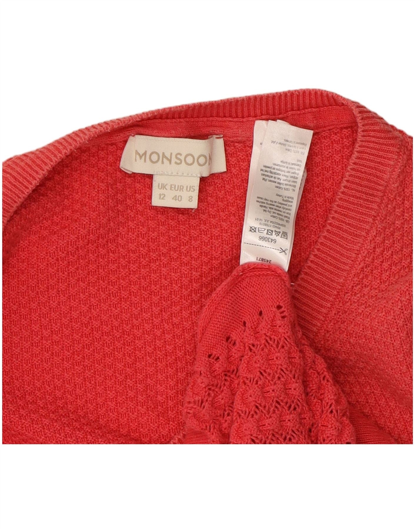 MONSOON Womens 3/4 Sleeve Cardigan Sweater UK 12 Medium Red Cotton
