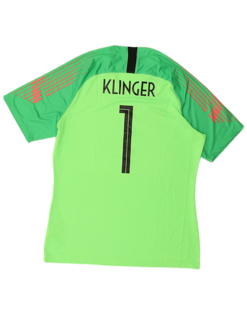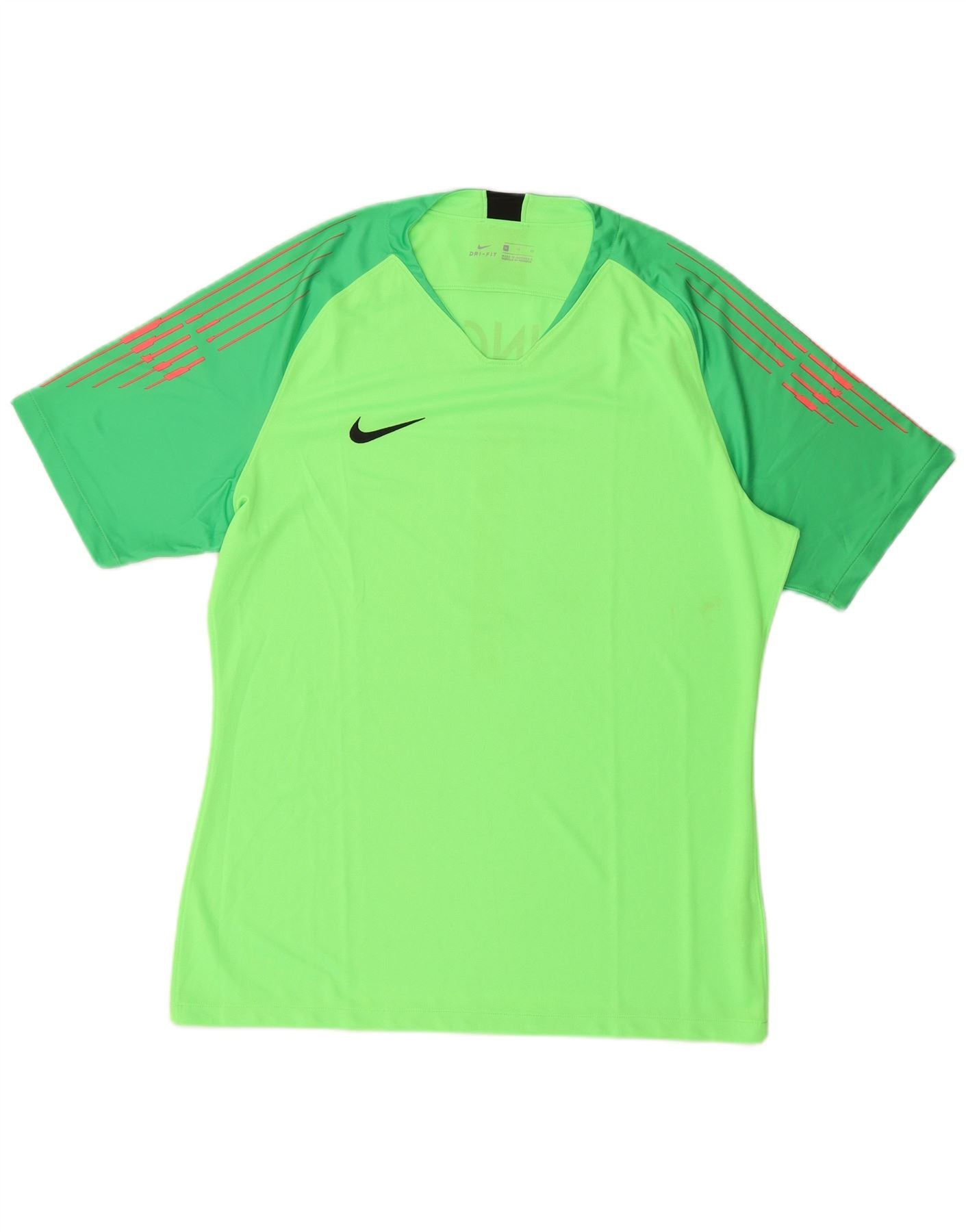 - AI Description: This Nike mens Graphic T-Shirt Top is crafted from a lightweight polyester knit, featuring Nike Dri-Fit technology. It offers a regular fit with short sleeves and a V-neckline. Designed for goalkeepers, this performance top includes a prominent logo accent. The breathable fabric ensures comfort and ease of movement during football.
