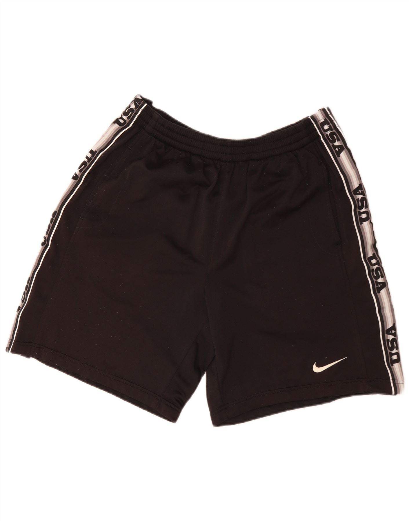 - Opis sztucznej inteligencji: Męskie spodenki sportowe Nike są wykonane z gładkiej czarnej poliestrowej dzianiny. Mają sportowy, regularny krój z elastyczną talią do wciągania. Boczne paski z tekstem USA i logo Nike dodają charakterystycznego brandingu. Praktyczne kieszenie zwiększają funkcjonalność. Konstrukcja zapewnia wygodę i styl podczas aktywnego noszenia.